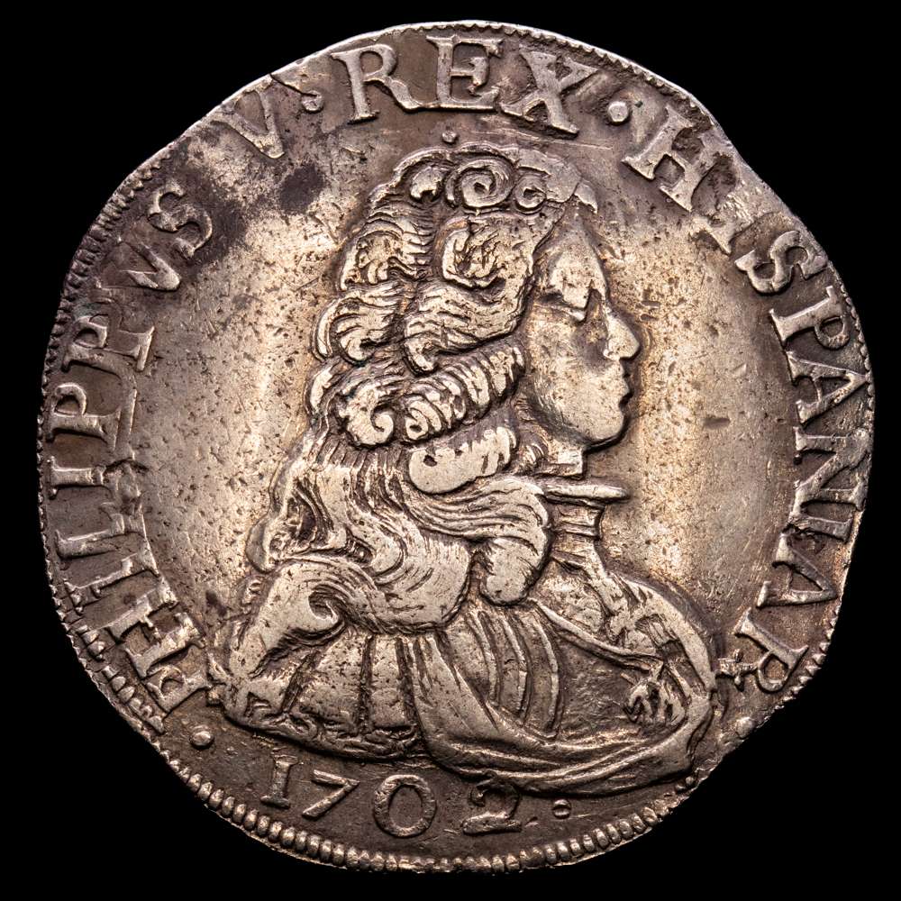 Felipe V. Milán. Escudo. 1702. Busto del rey a derecha con armadura y toisón y leyenda PHILIPVS·U·REX·HISPANIAR y fecha bajo el busto. En reverso escudo con las armas de Castilla, León, Granada, Sicilia, los dos de Borgoña, Brabante, Flandes, Tirol, Milán y el de la Casa de Borbón con leyenda MEDIOLANI·DVX·ET·C·. Hora. 1419 Lam.XXXII nº 8. Olivares 288-R, MIR 393/2; vte. con busto mayor. 27,67 gramos. Magnífico ejemplar, muy centrado. Pátina. Muy escaso así. MBC+.
