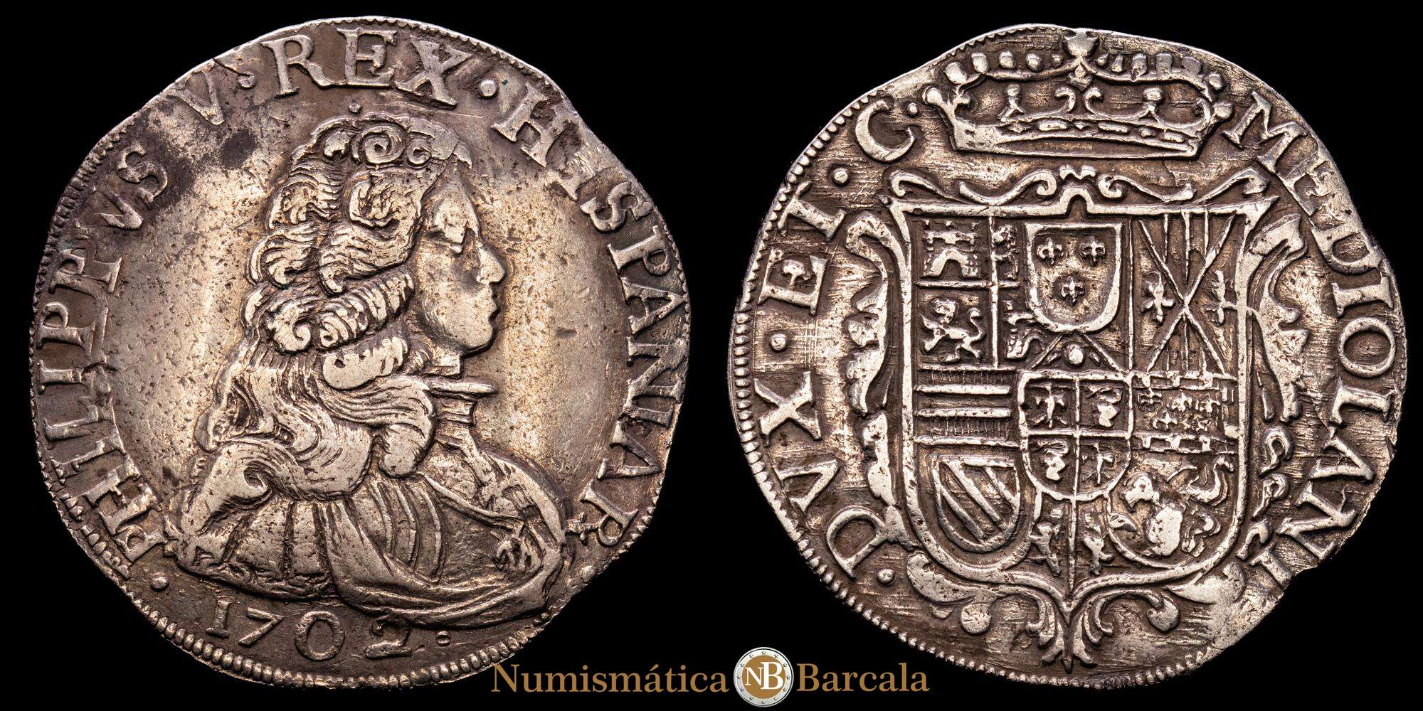 Numismática Barcala > Productos > Felipe V. Milán. Escudo. 1702. Olivares 288-R, MIR 393/2; vte. con busto mayor. 27,67 gramos. Magnífico ejemplar, muy centrado. Pátina. Muy escaso así. MBC+.