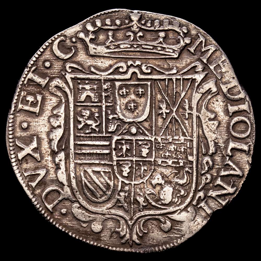 Felipe V. Milán. Escudo. 1702. Olivares 288-R, MIR 393/2; vte. con busto mayor. 27,67 gramos. Magnífico ejemplar, muy centrado. Pátina. Muy escaso así. MBC+.