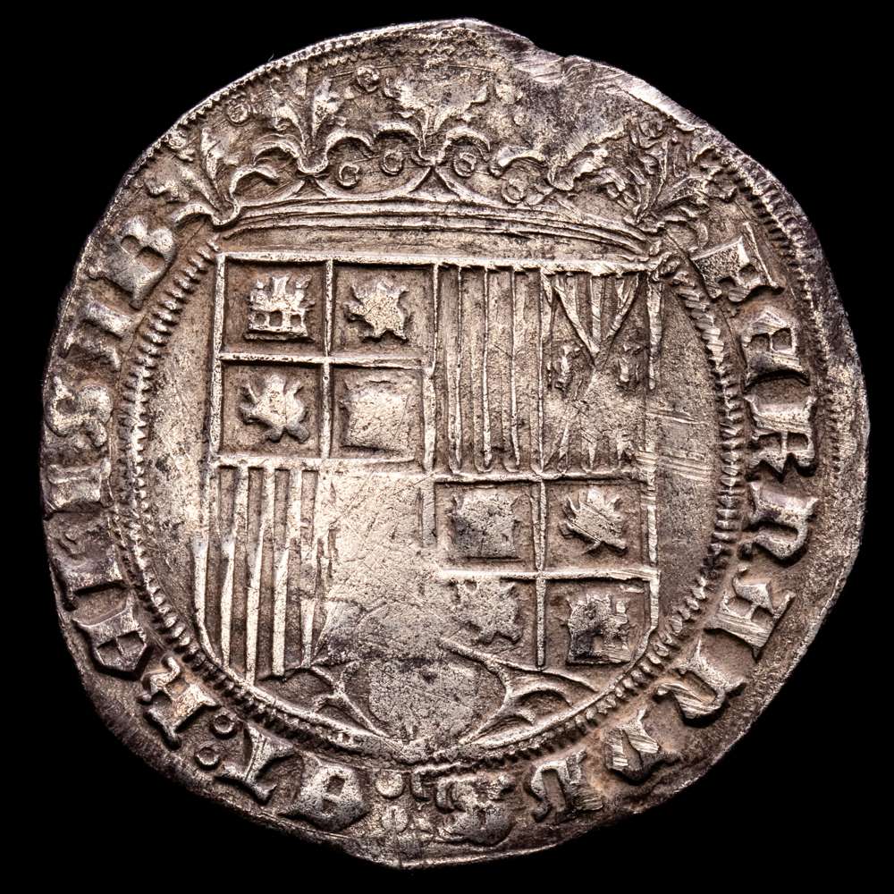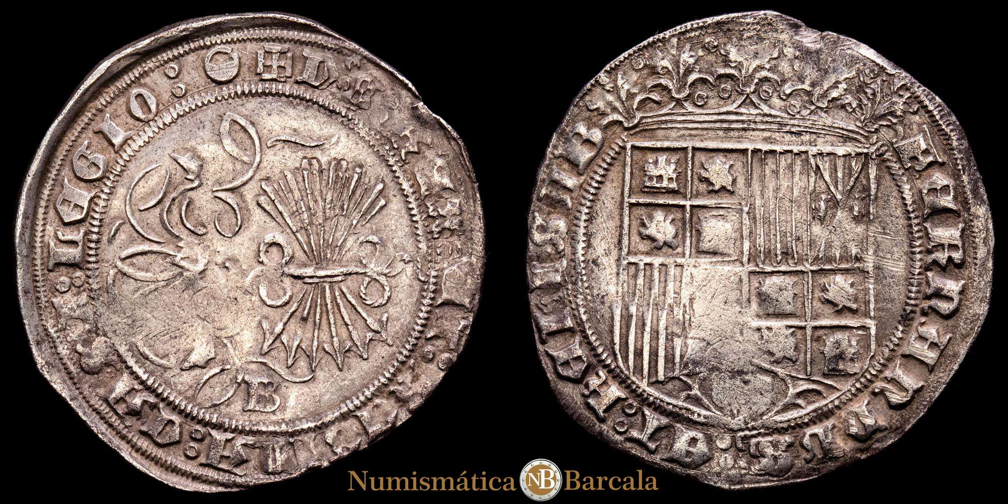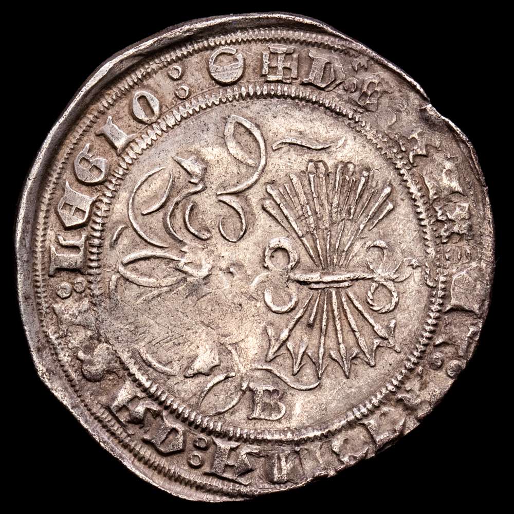 Numismática Barcala > Productos > Fernando e Isabel (1474-1504). 1 real. Burgos. (Cal-298). Ag. 3,25 gramos. Con B en reverso y la ley. empieza en “caldero” y cruz potentada. Suave y bonita pátina. Escasa. MBC.