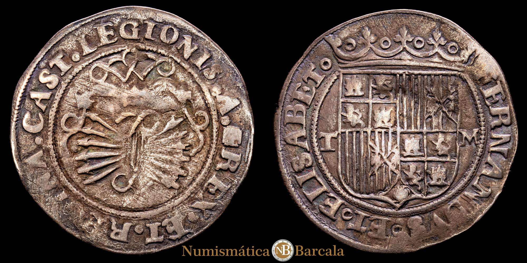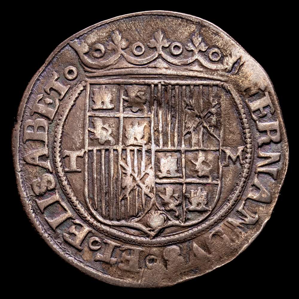 Fernando e Isabel (1474-1504). 1 real. Toledo. M. (Cal-468). Ag. 3,29 gramos. Escudo entre T y M. MBC.