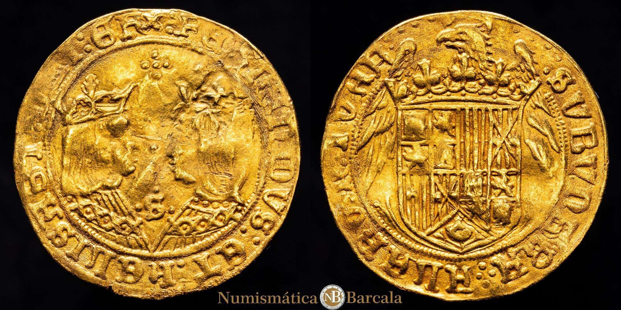 Numismática Barcala > Productos > Fernando e Isabel (1474-1504). Doble excelente. Sevilla. (Cal-732). Anv.: + FERNANDVS ET ELISABET DEI GR(A) R(E)X. Rev.: SVB VMBRA ALARVM TVAR(VM). Au. 6,82 gramos. VF+.