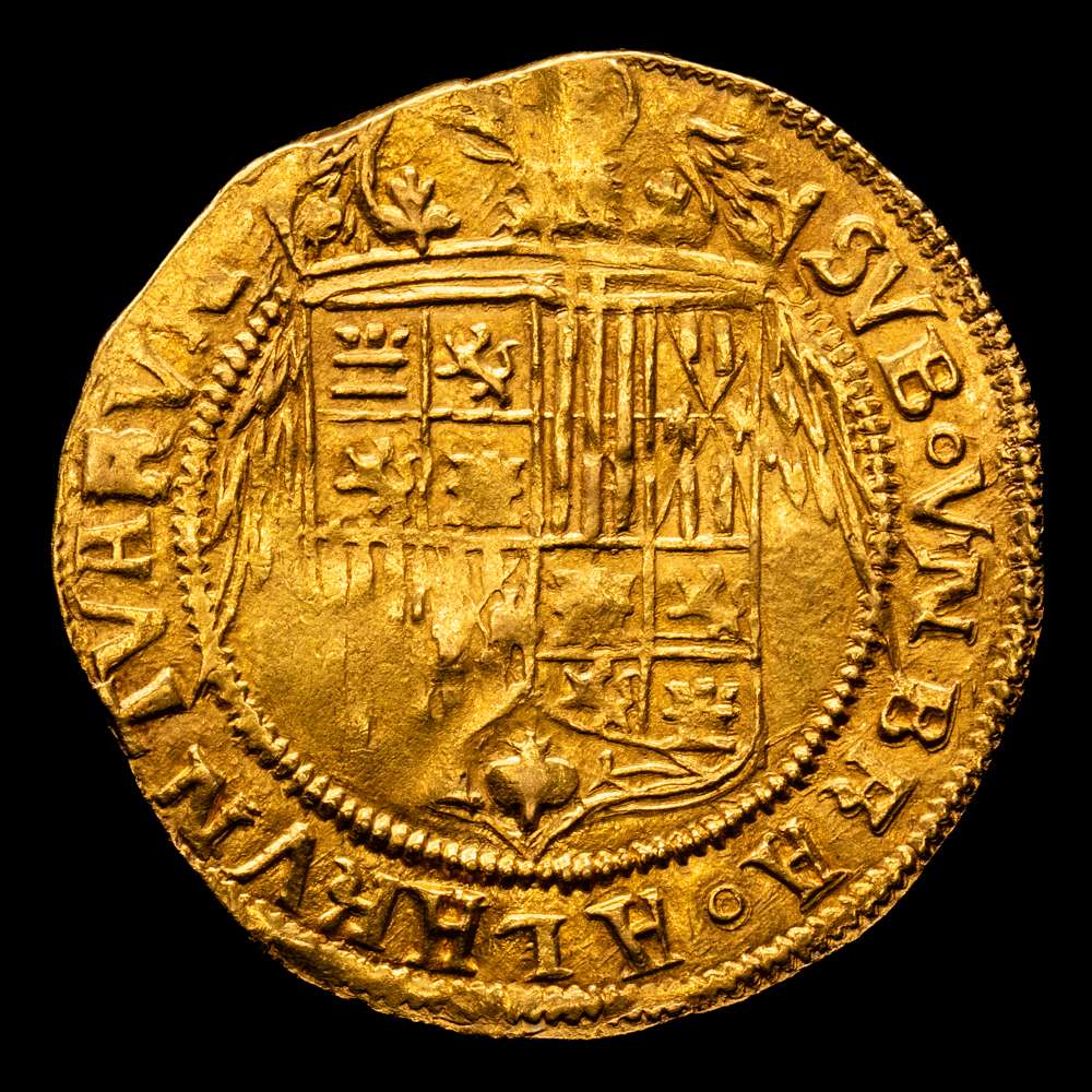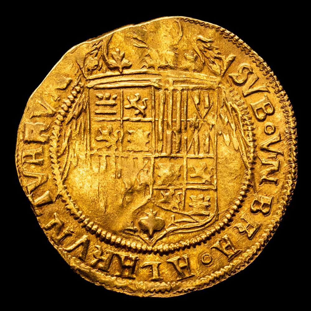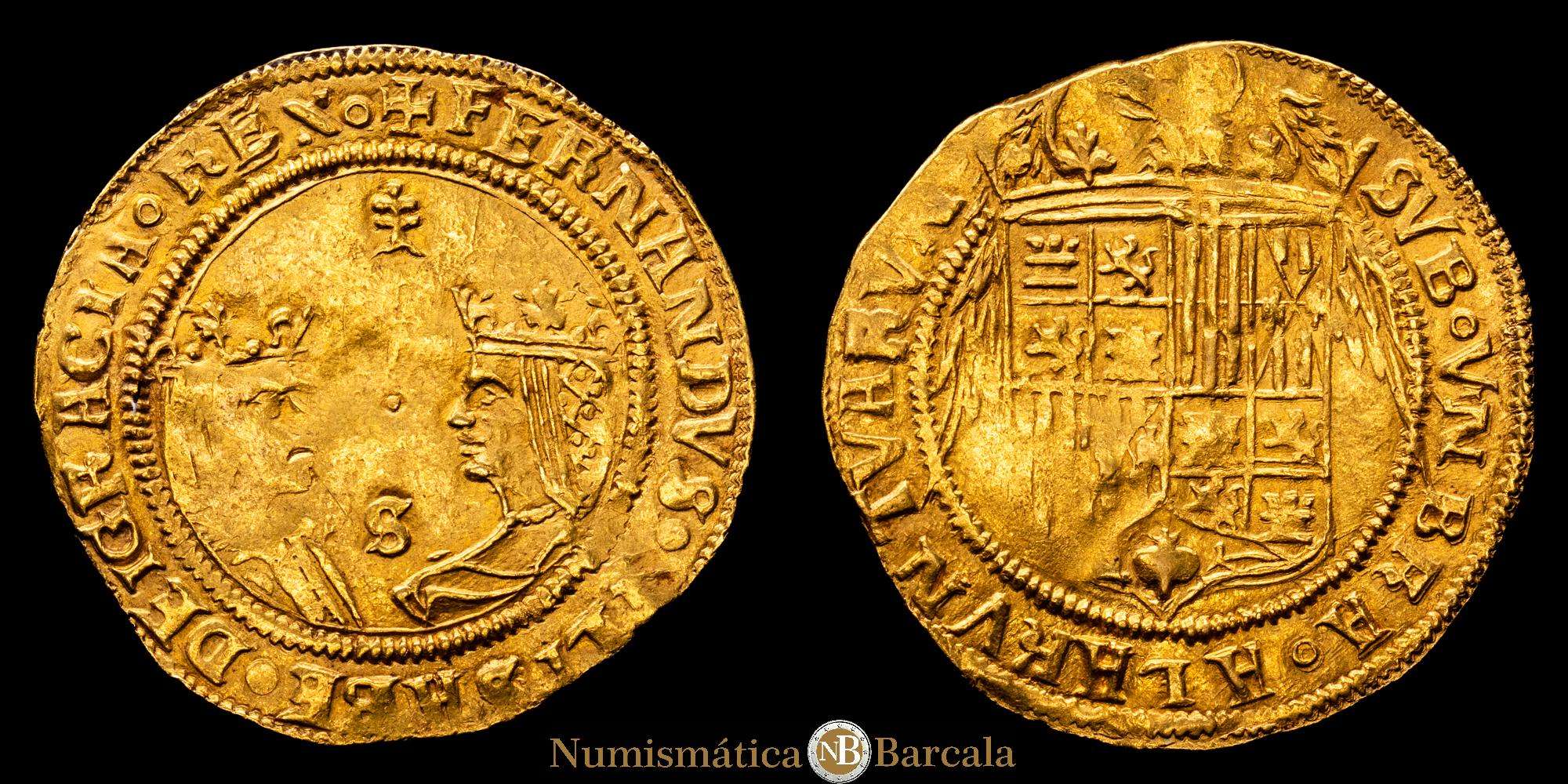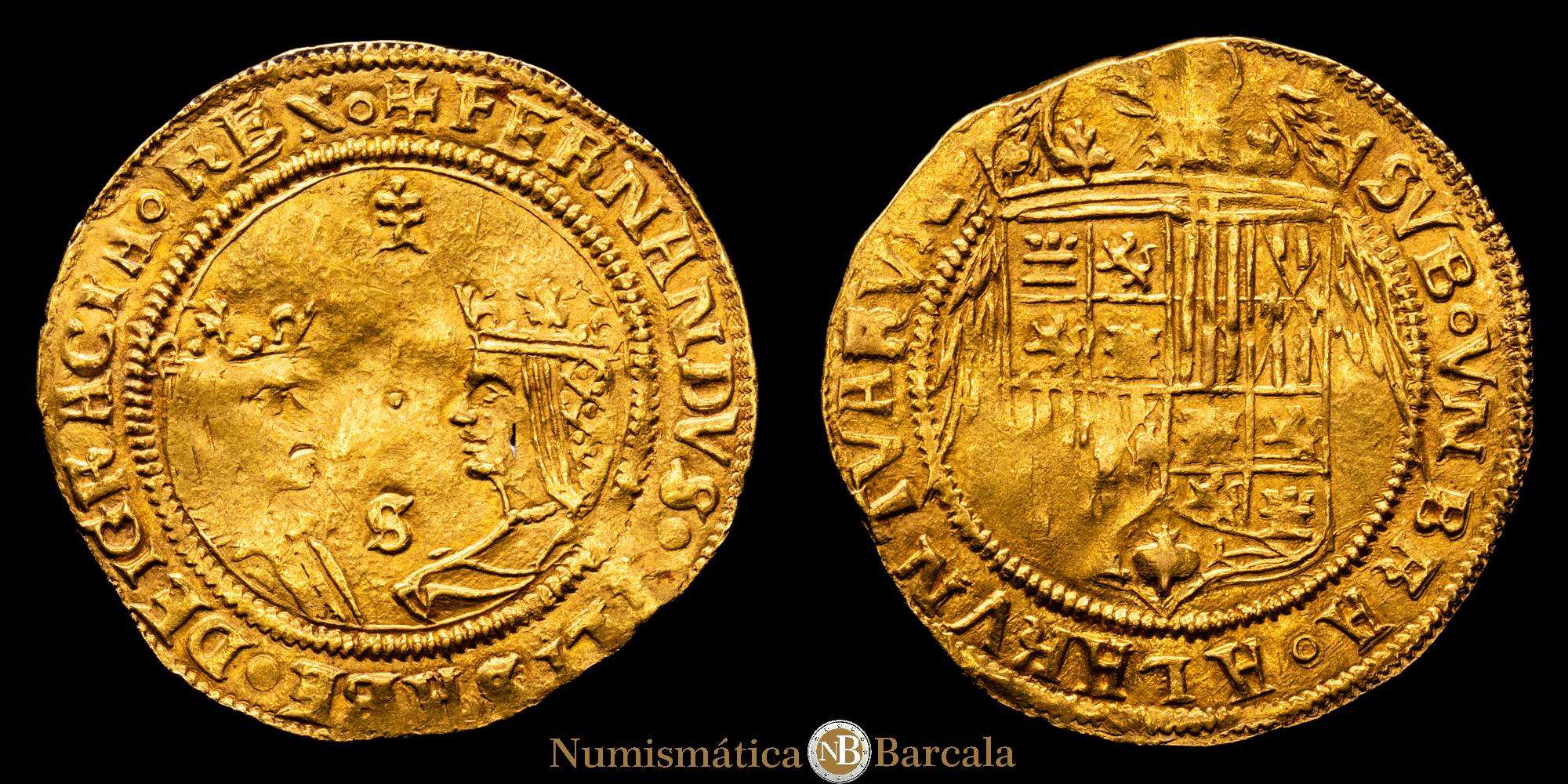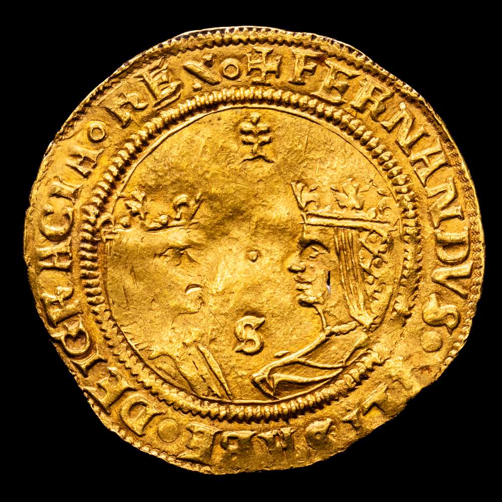Fernando e Isabel (1474-1504). Doble excelente. Sevilla. (Cal-739). (Bautista-2243). Armiño encima, punto entre los bustos y S debajo. Anv.: + FERNANDVS ET · ELISABE(T) · DEI GRACIA. REX. Rev.: SVB · VNBRA · ALARVN ·TVARVN.