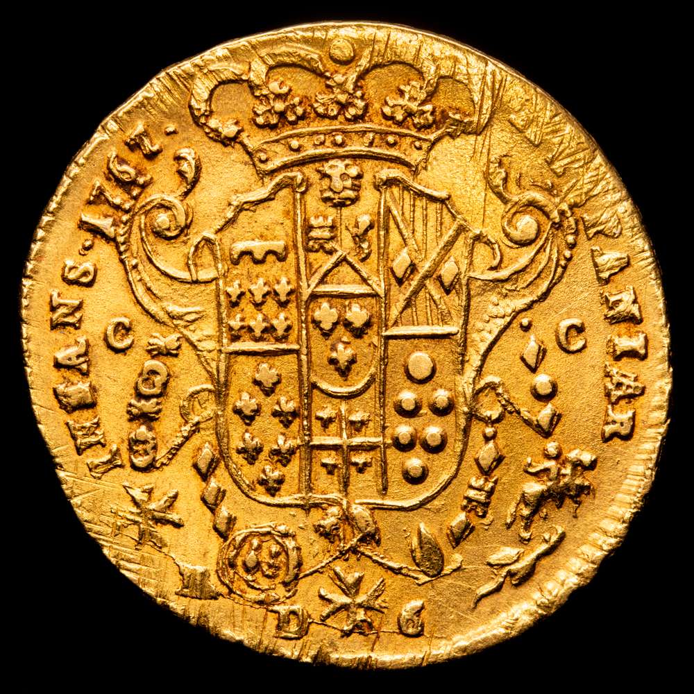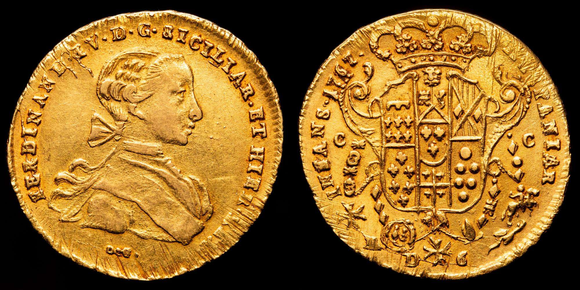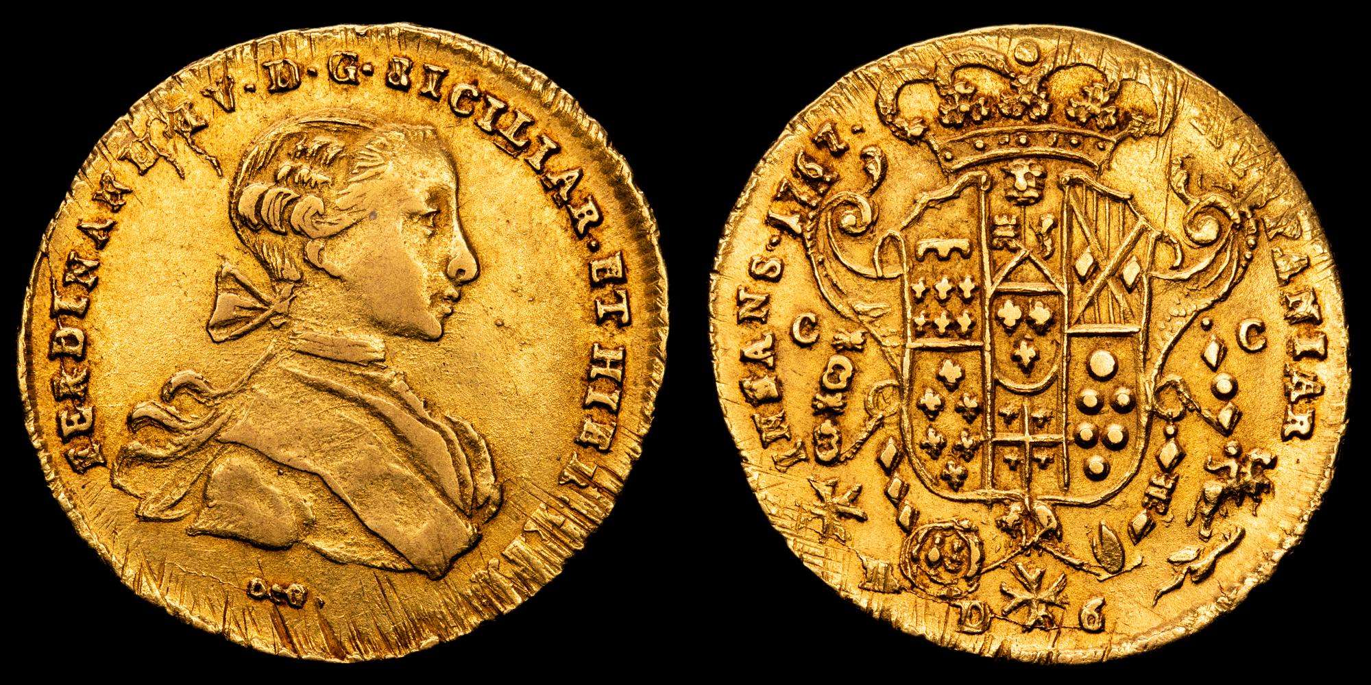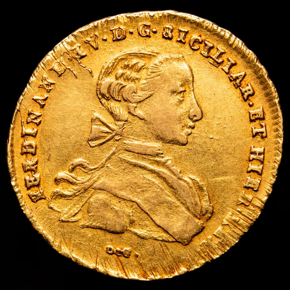 Fernando IV de Borbón (1759-1799) – 6 Ducati 1767 – Ceca: Nápoles – (CNI XX-568-45) (Pannuti-Riccio n. 10) (Gig. n 10) (Mont. n. 133). Anverso: busto del Rey a la derecha – Reverso: escudo coronado entre dos ramas de palma y laurel entrelazadas en la base – 8.82 gr. XF+.