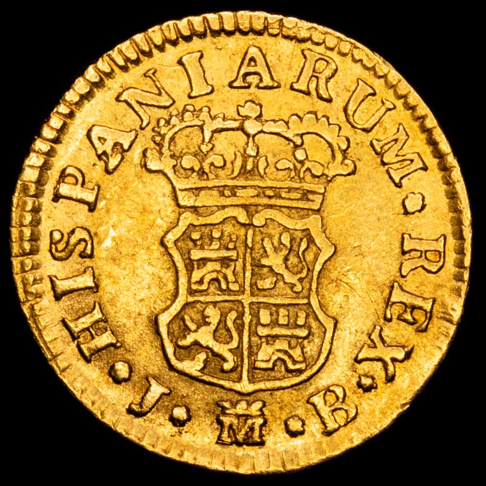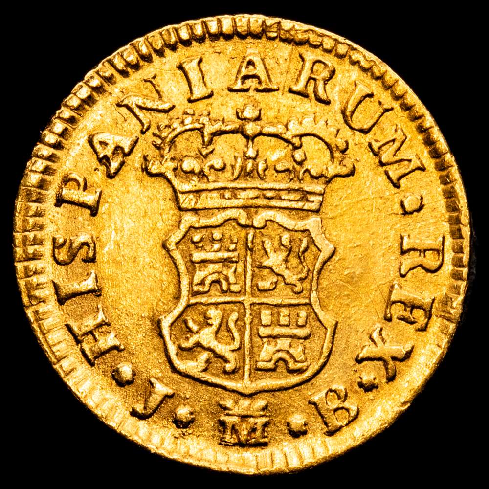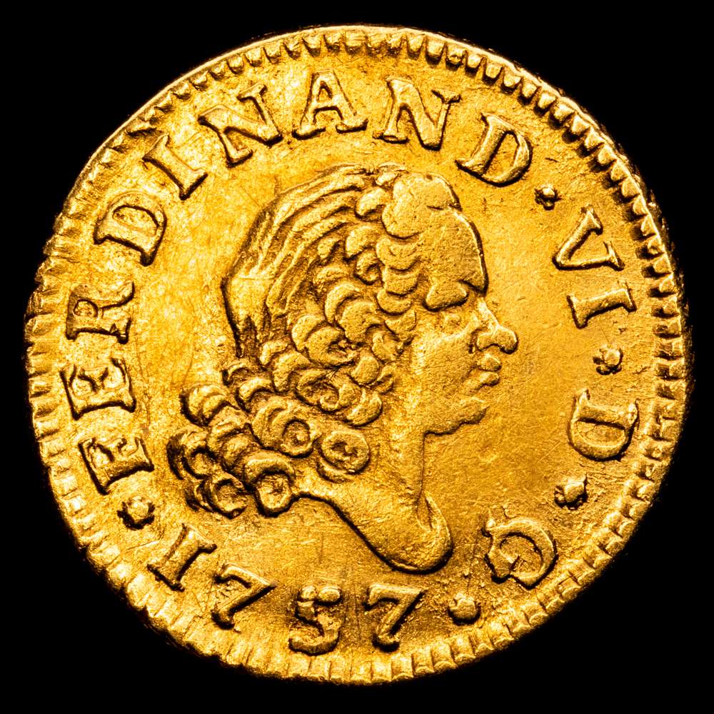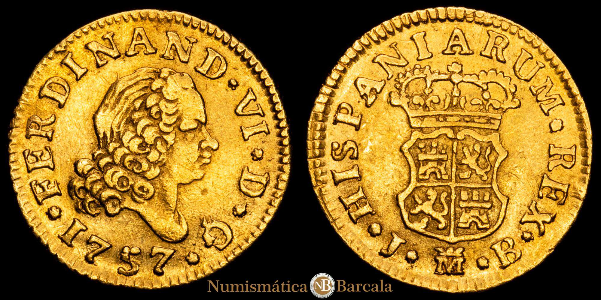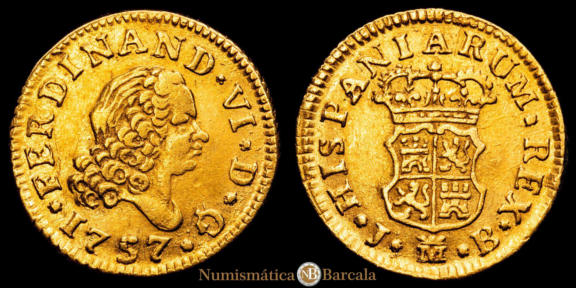 Numismática Barcala > Productos > Fernando VI (1746-1759). 1/2 escudo. 1757. Madrid. JB. (Cal-561). Au. 1,73 gramos. Cuarto busto. MBC+.