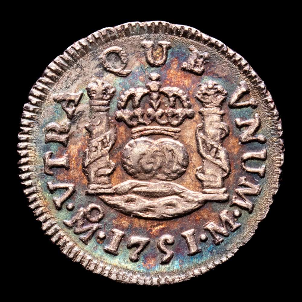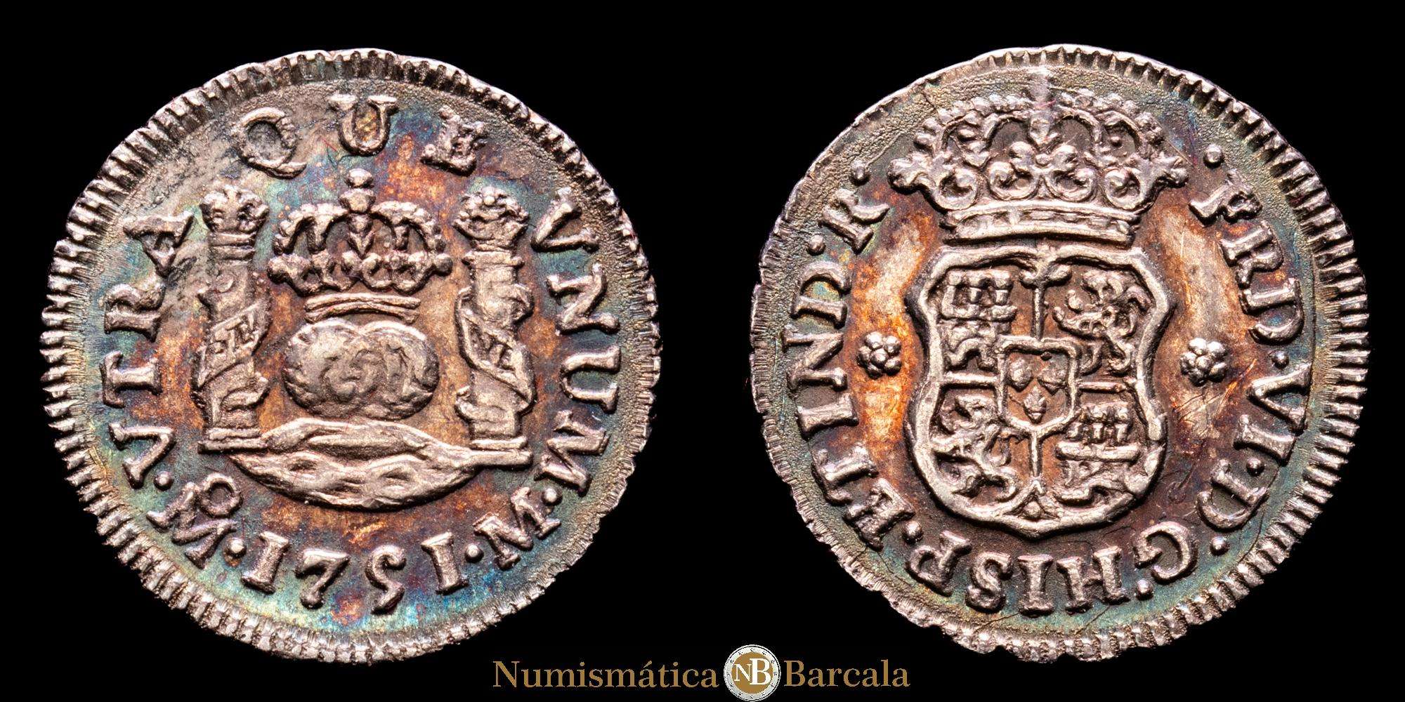 Numismática Barcala > Productos > Fernando VI (1746-1759). 1/2 real. 1751. México. M. (Cal-84). Ag. 1,62 gramos. Bonita pátina irisada. Buen ejemplar. Escasa así. EBC.