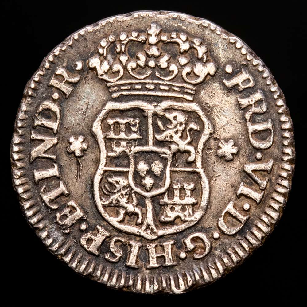 Fernando VI (1746-1759). 1/2 real. 1759. Lima. JM. (Cal-63). Ag. 1,65 g. Atractivo ejemplar con todos sus detalles bien definidos. Rara en esta conservación. Bonita pátina. EBC-.