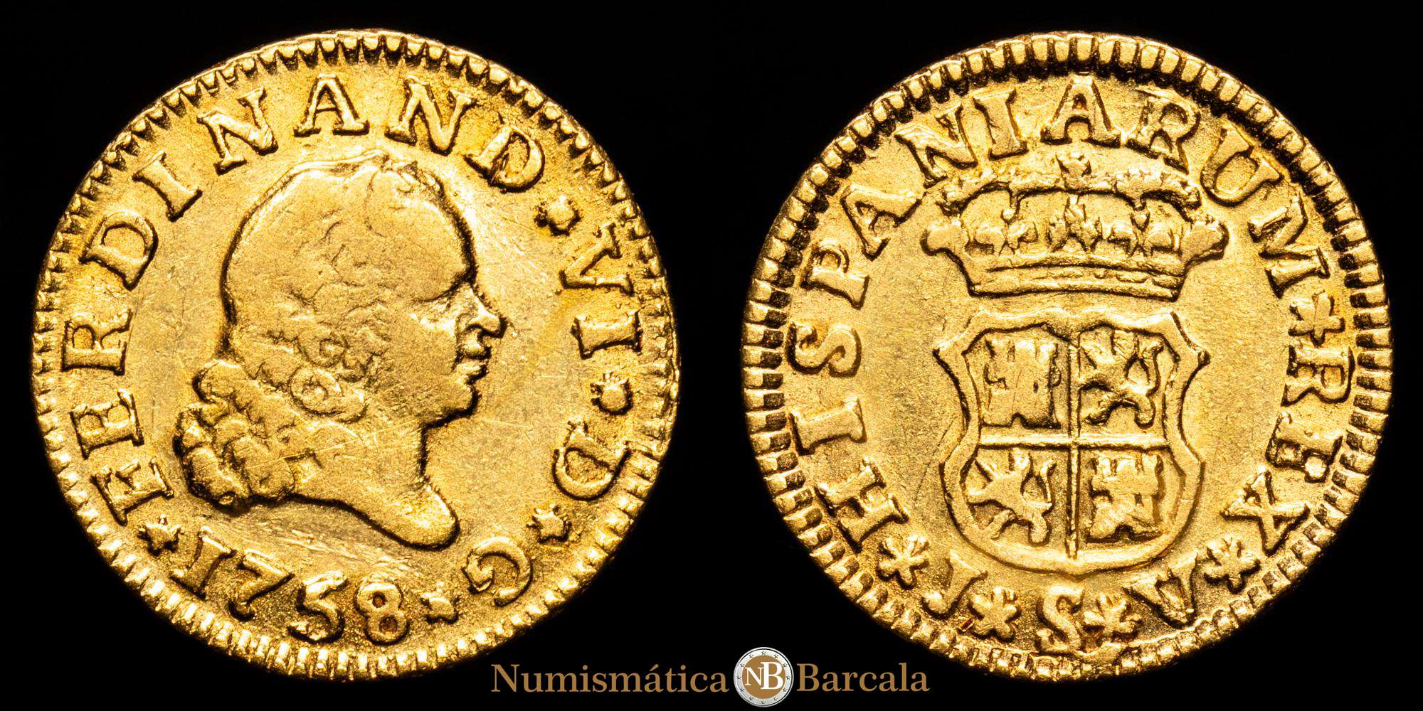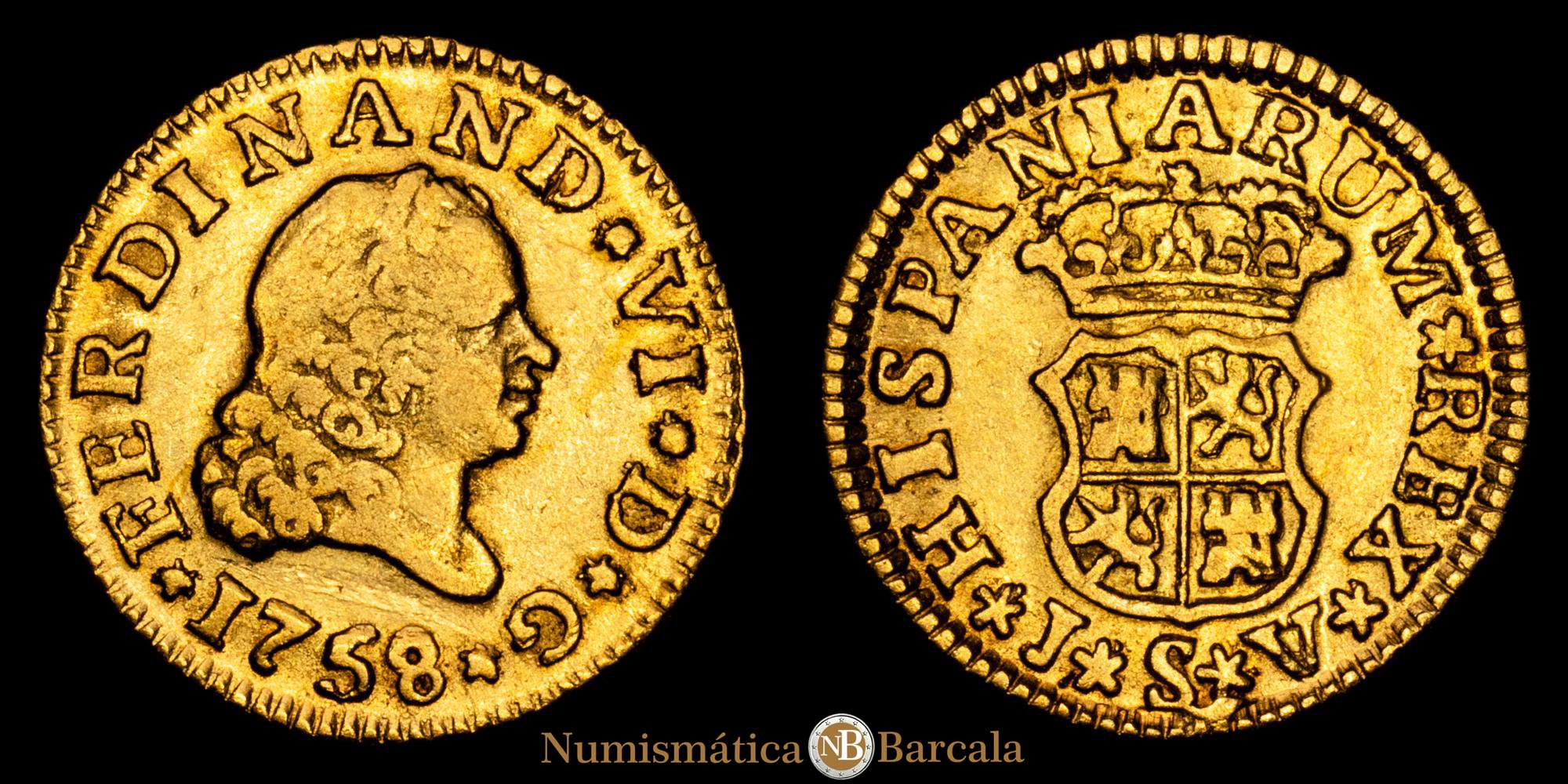 FERNANDO VI (1746-1759). 1758 JV. Sevilla. 1/2 escudo (AC 586). 1,75 gr Au. MBC.
