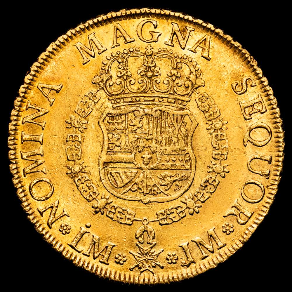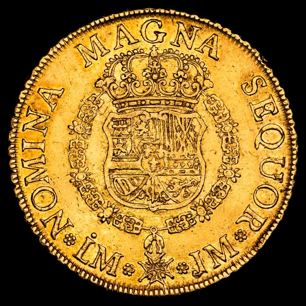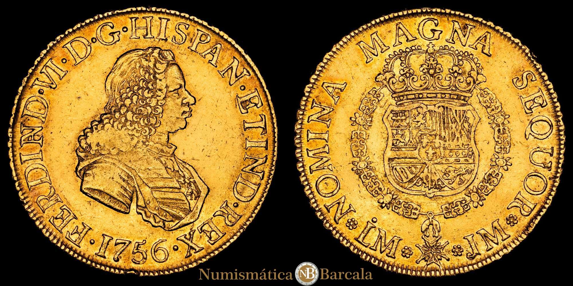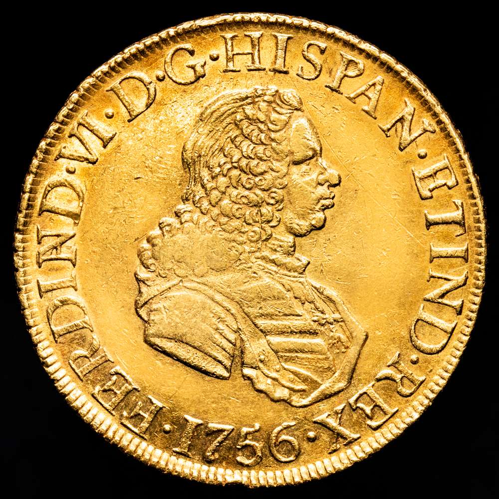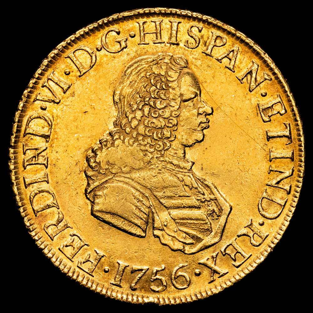 Fernando VI (1746-1759). 8 escudos. 1756. Lima. JM. (Cal-771). (Cal onza-584). Au. 26,93 gramos. Punto sobre el monograma LMA. Rayita en el anverso y golpecitos en el canto. Restos de brillo originales. Rara. EBC-/MBC+.