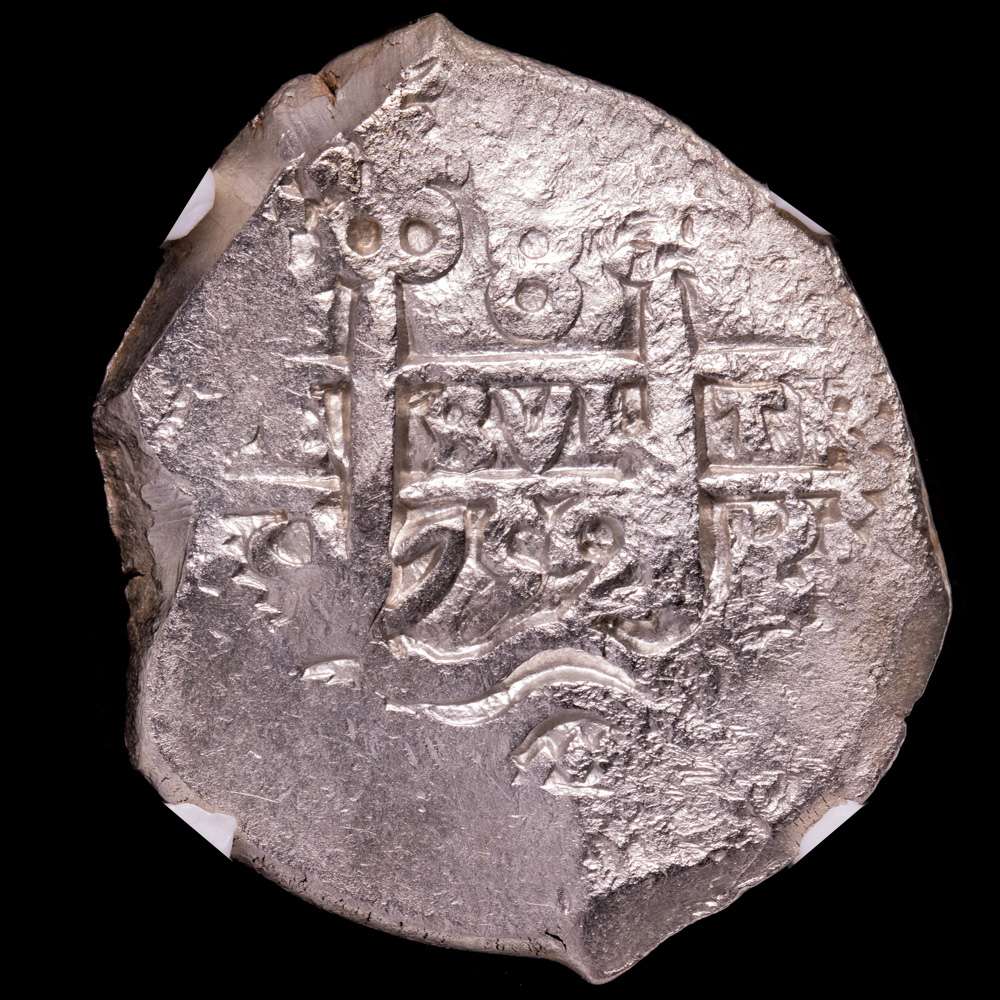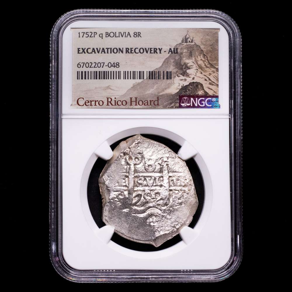 Numismática Barcala > Productos > Fernando VI (1746-1759). 8 reales. 1752. Potosí. q. (Cal-522). Ag. Encapsulada por NGC como Excavation Recovery AU. Etiqueta especial “Acaparamiento de Cerro Rico”.