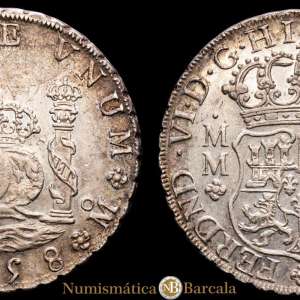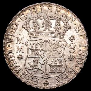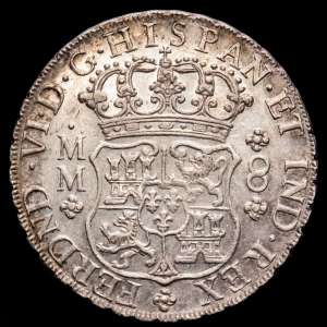 Fernando VI (1746-1759). 8 reales. 1758. México. MM. (Cal-494). Ag. 26,85 g. Restos de brillo original. Atractivo ejemplar. EBC+. Ligera pátina.