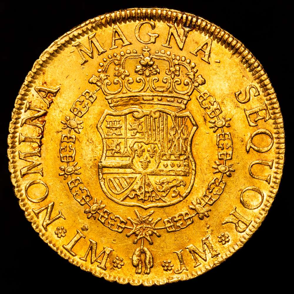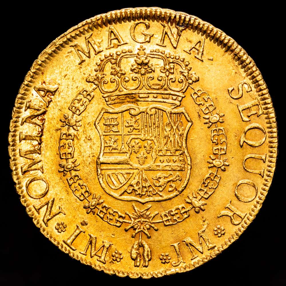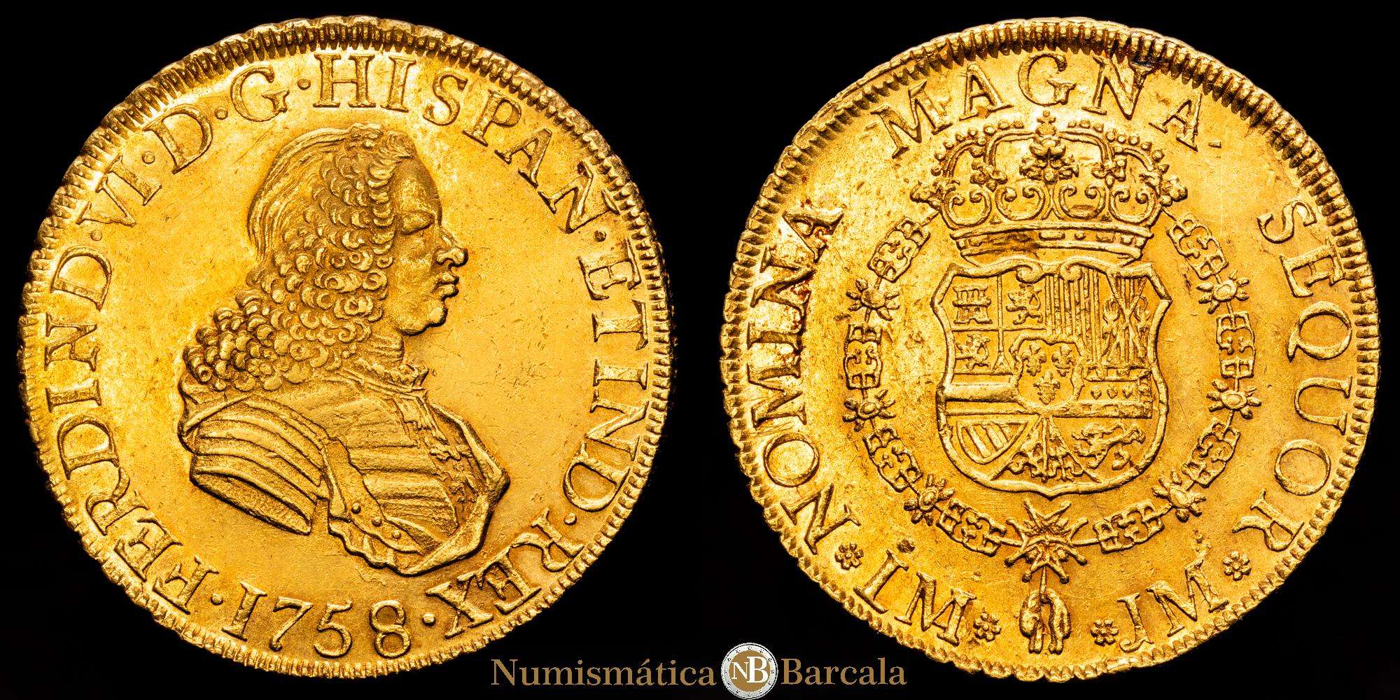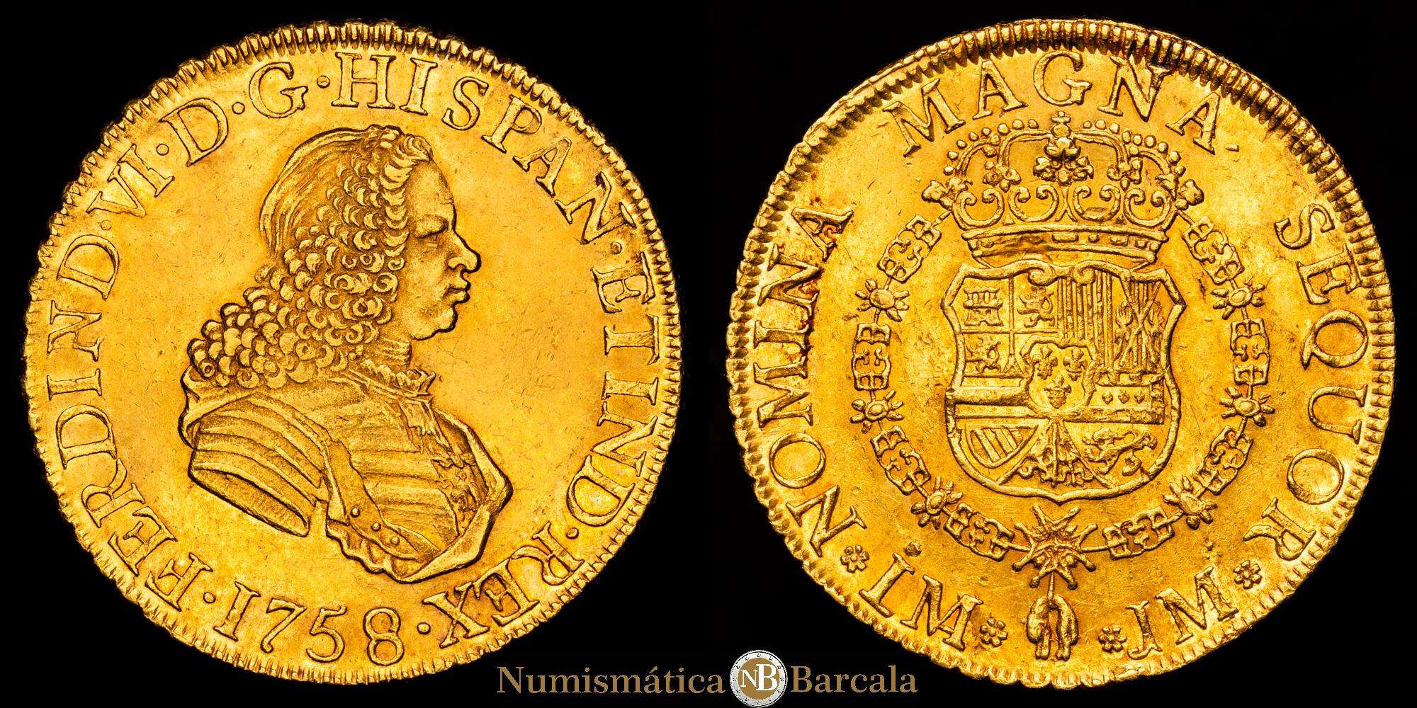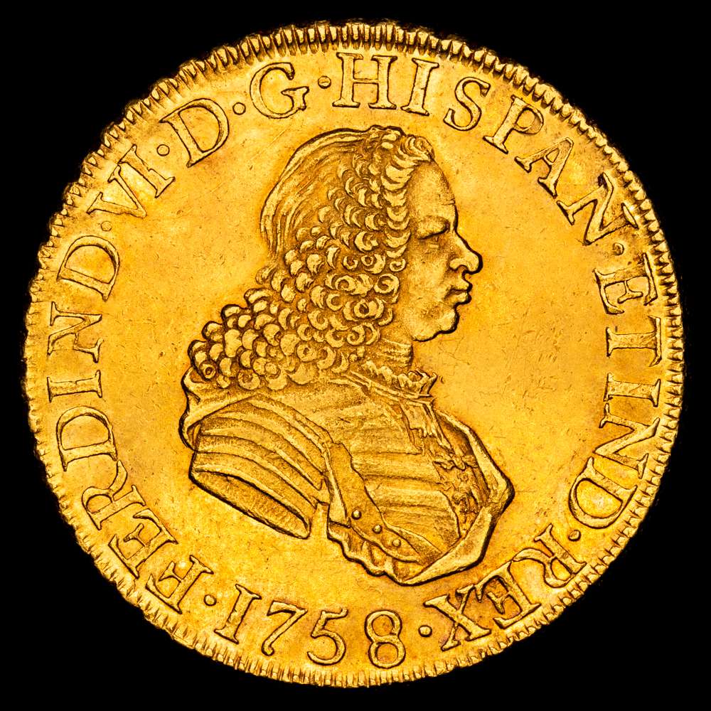 Fernando VI. (1746-1759). Lima. JM. 8 escudos. 1758. (AC. 774) (Cal. Onza 588). Sin punto sobre el ensayador. Conserva parte de su brillo original. Rara. 27,05 g. Precioso color. XF.