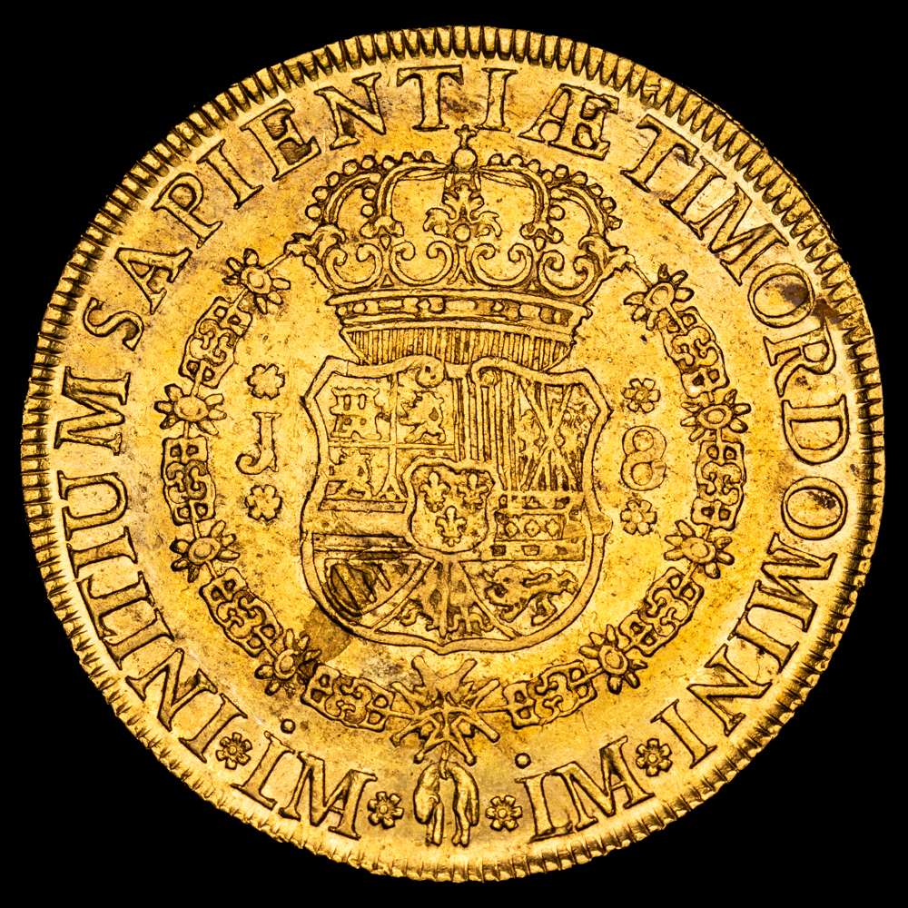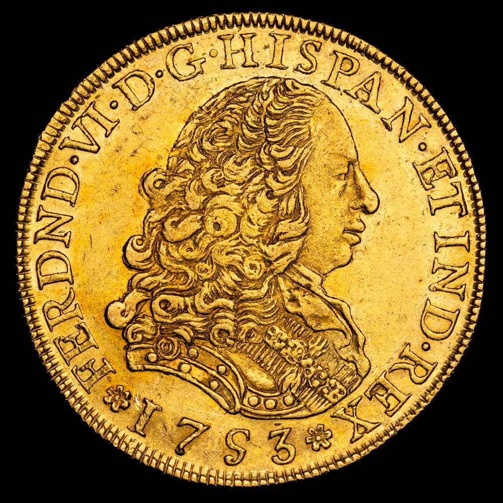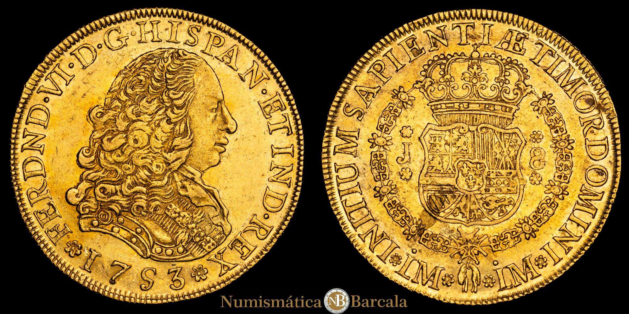 Fernando VI. 1753 Lima. J. 8 escudos. (AC. 766) (Cal.Onza 579). Pequeñas laminaciones en reverso. Rastros de lustre alrededor de leyendas. Atractivo. Muy escaso. 26,95 gramos. EBC-.