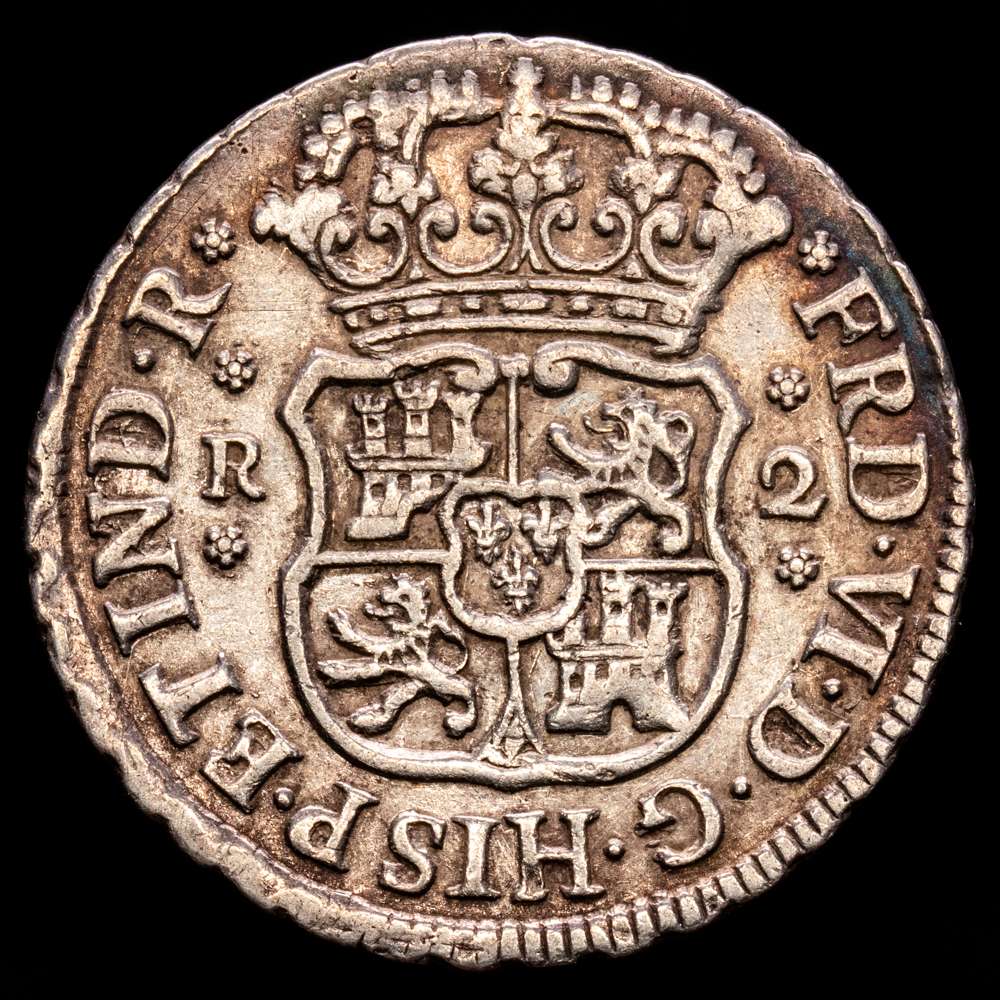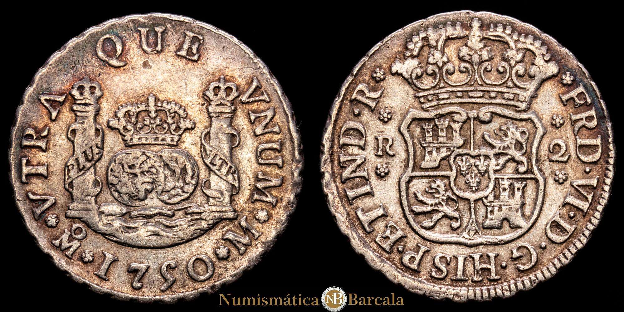 Fernando VI. 2 Reales. (6,67 g.). México. 1750. M. Casa de Moneda de la Ciudad de México. KM-86.1; Gilboy M-2-23; Yonaka-M2-50. (Cal-289). Moneda bien acuñada, una hermosa pátina con sutiles reflejos iridiscentes que resaltan al inclinarla bajo la luz. Un ejemplar muy atractivo. MBC+.