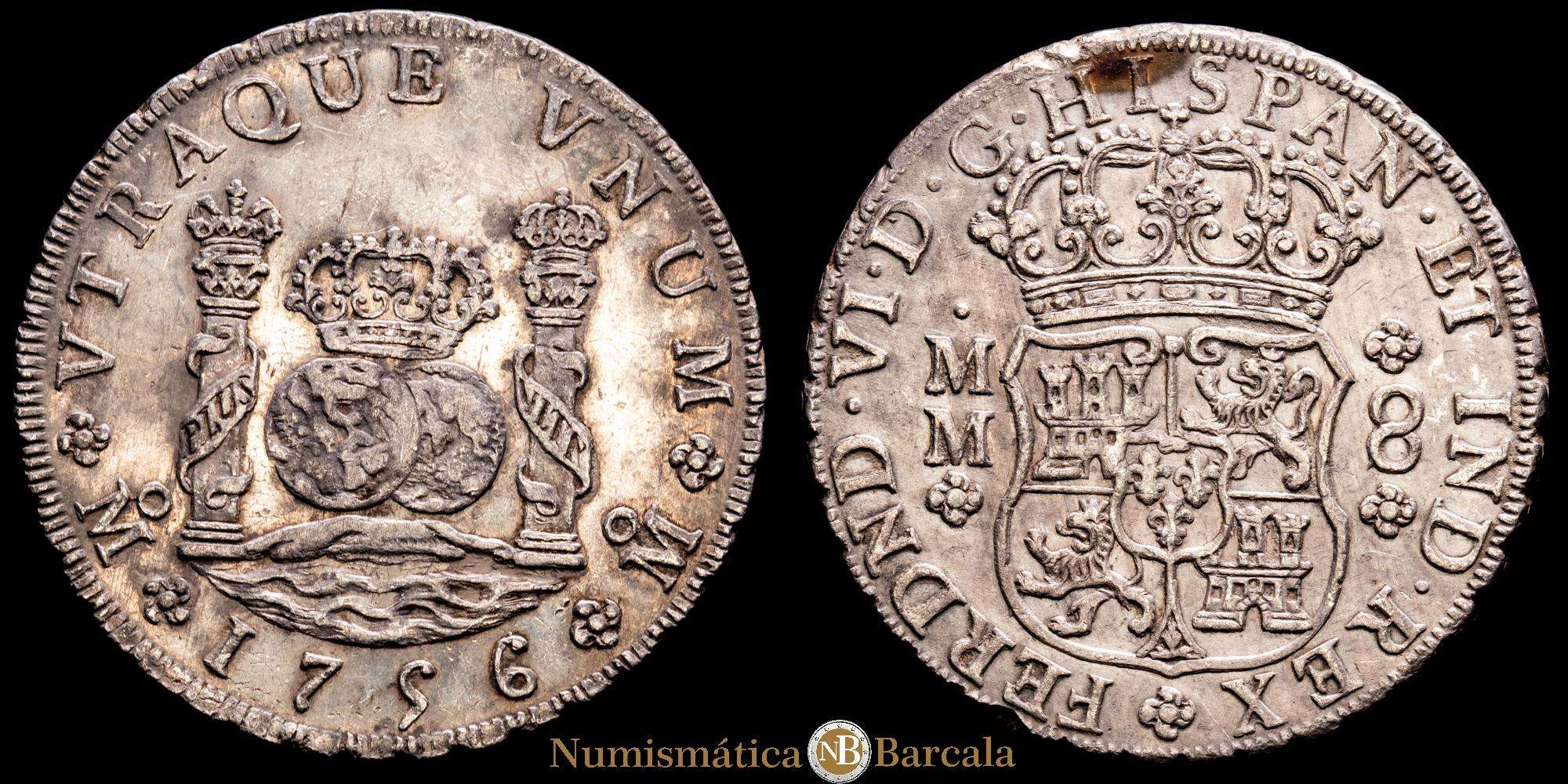 Numismática Barcala > Productos > Fernando VI. México. MM. 8 reales. (AC.491). Columnario. Buena acuñación. Tono. Parte de brillo original. Escasa así. 26,83 gramos. EBC+/EBC.
