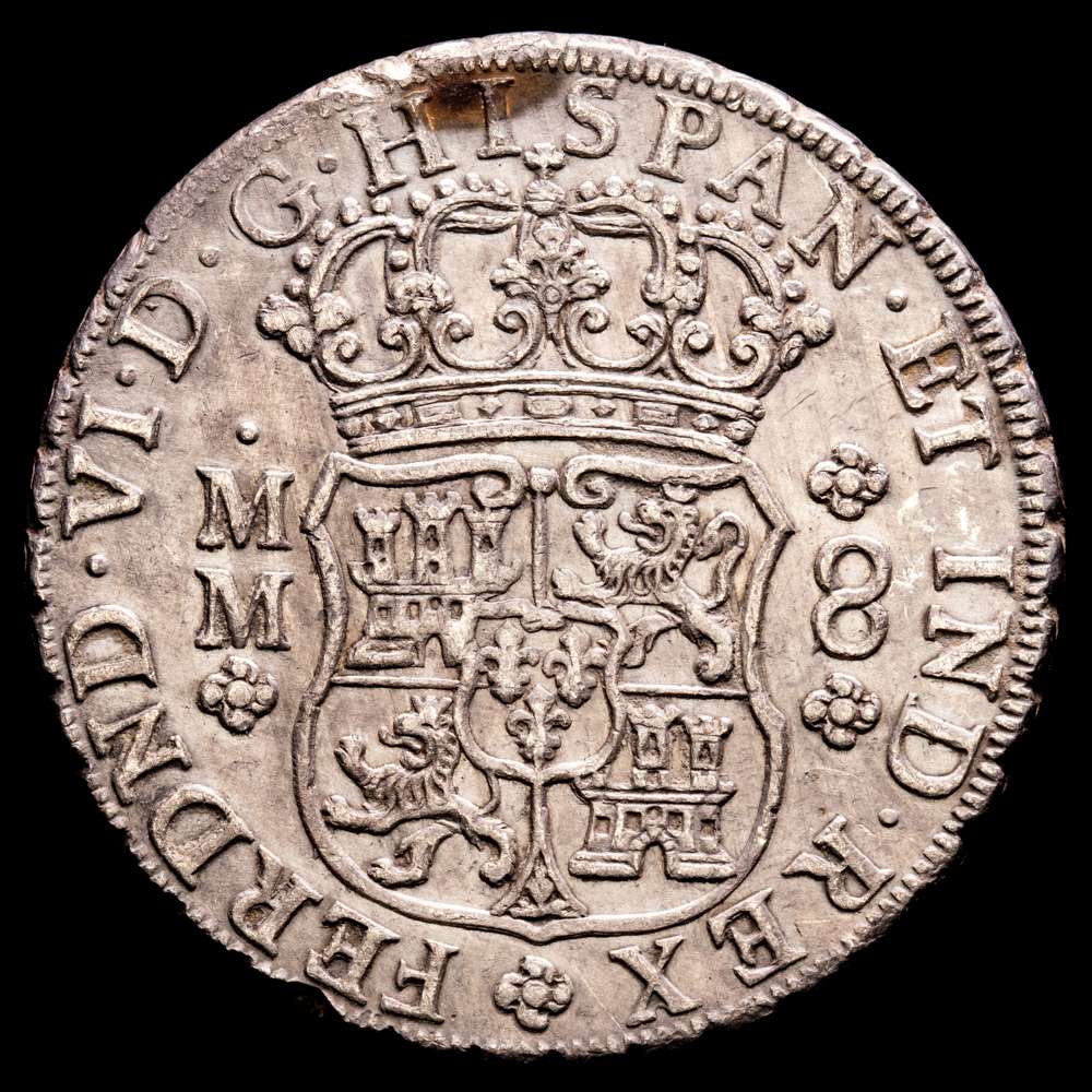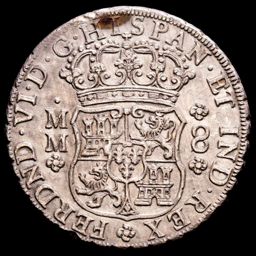Fernando VI. México. MM. 8 reales. (AC.491). Columnario. Leve manchila en el reverso. Buena acuñación. Tono. Parte de brillo original. Escasa así. 26,83 gramos. EBC+/EBC.