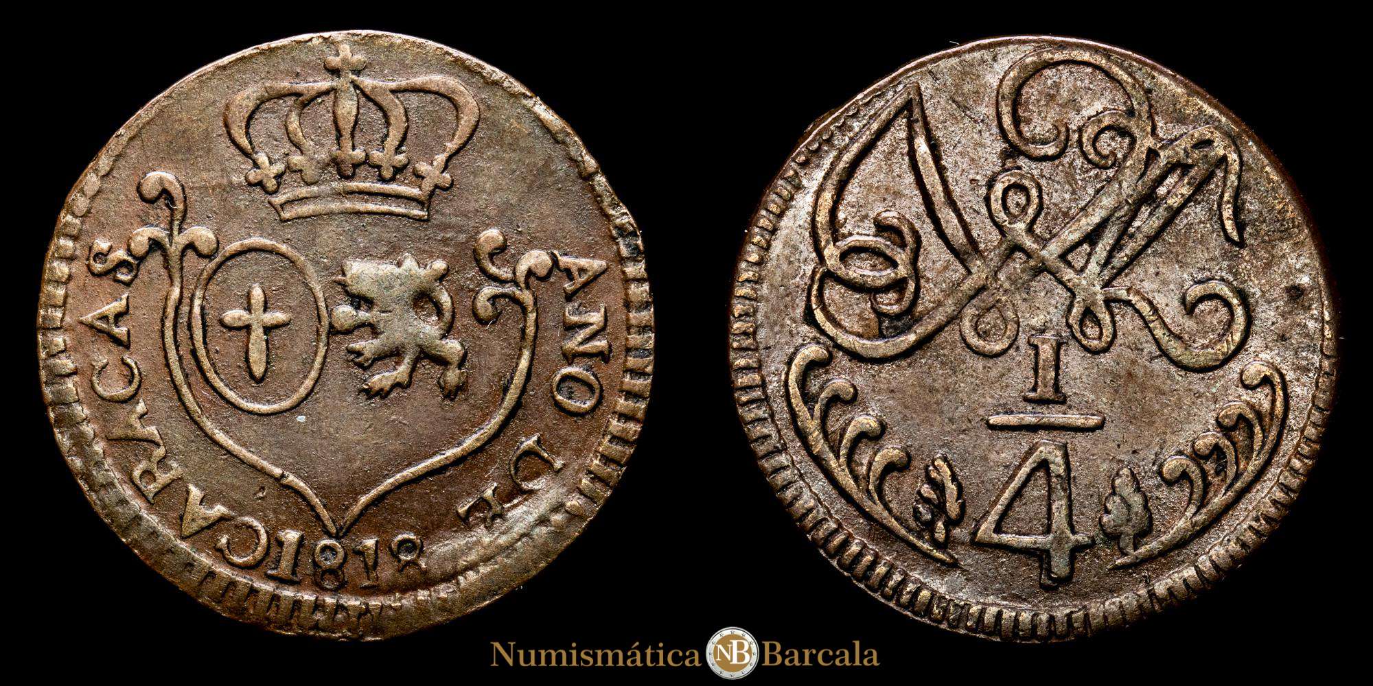Numismática Barcala > Productos > Fernando VII. 1/4 Real. (2.66 g.). Venezuela. 1818. Aureo y Calicó-68. MBC+. Escasa