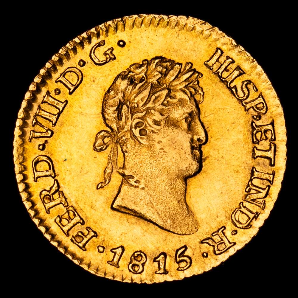 Fernando VII (1808-1833). 1/2 escudo. 1815/4. México. J.J. (Cal-1489). Au. 1,70 gramos. Sobrefecha. Gran parte de brillo originales. Rara en esta conservación. EBC+.