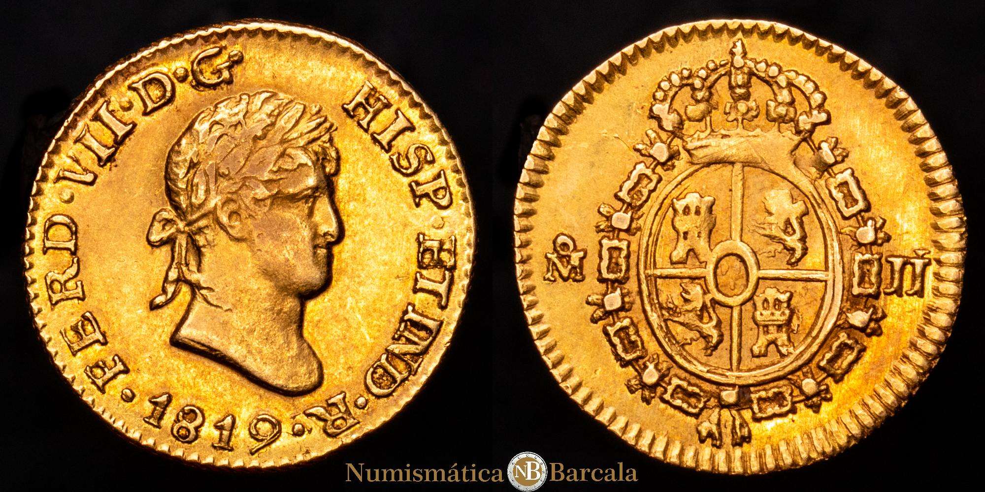 Fernando VII (1808-1833). 1/2 escudo. 1819. México. JJ segunda sigla rectificada sobre otra J. (Cal-1493). Au. 1,69 gramos. Bonito color. Muy escasa AU. Pocos ejemplares identificados.