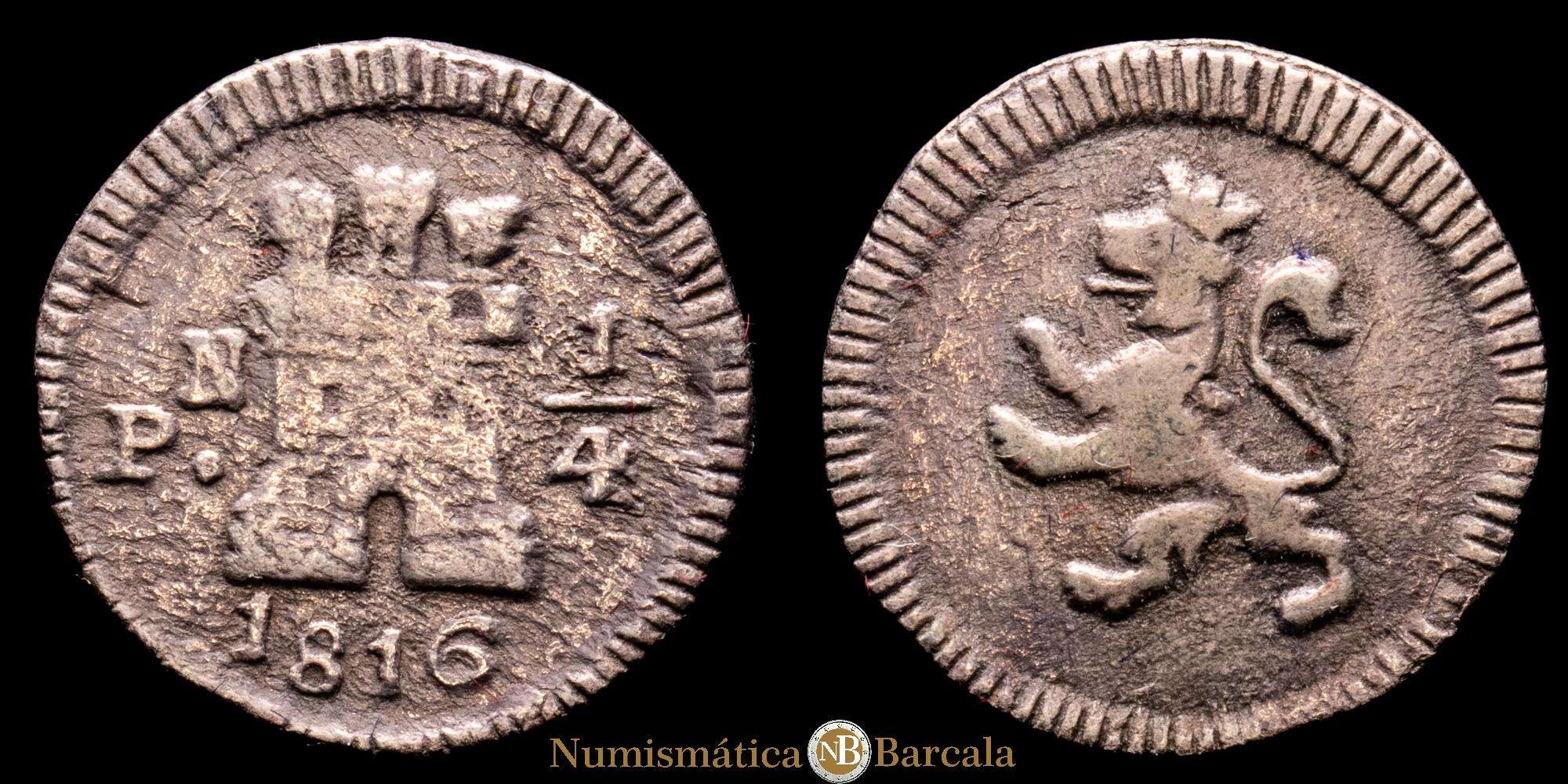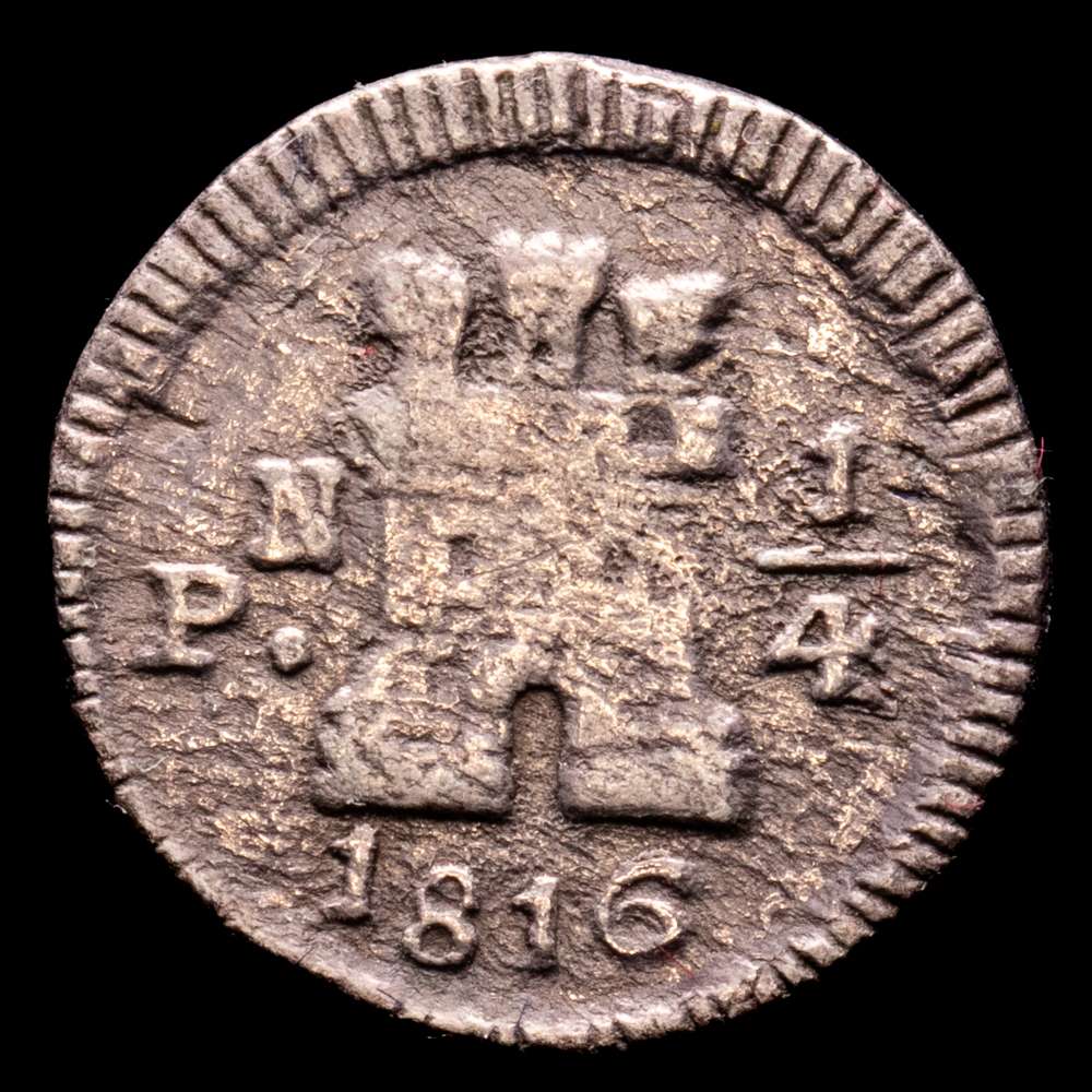Fernando VII (1808-1833). 1/4 real. 1816. Popayán. Marca de ceca N. (AC-283). (Restrepo 101-1). Ag. 0,76 g. El 6 de la fecha parece rectificado sobre otra cifra. Rara. MBC-.