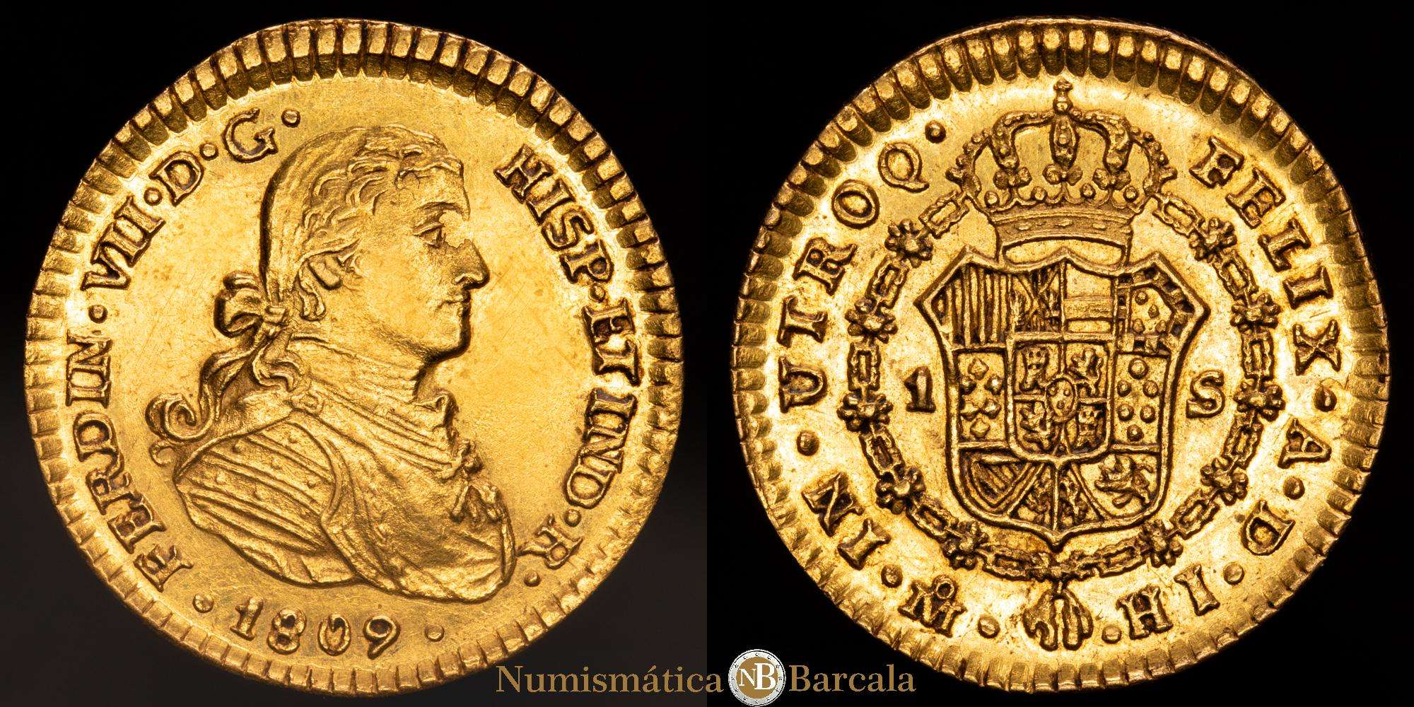 Fernando VII (1808-1833). 1 escudo. 1809. México. HJ. (Cal-1511). Au. 3,36 gramos. Busto imaginario. EBC/EBC+. Gran parte del brillo original. Rara.