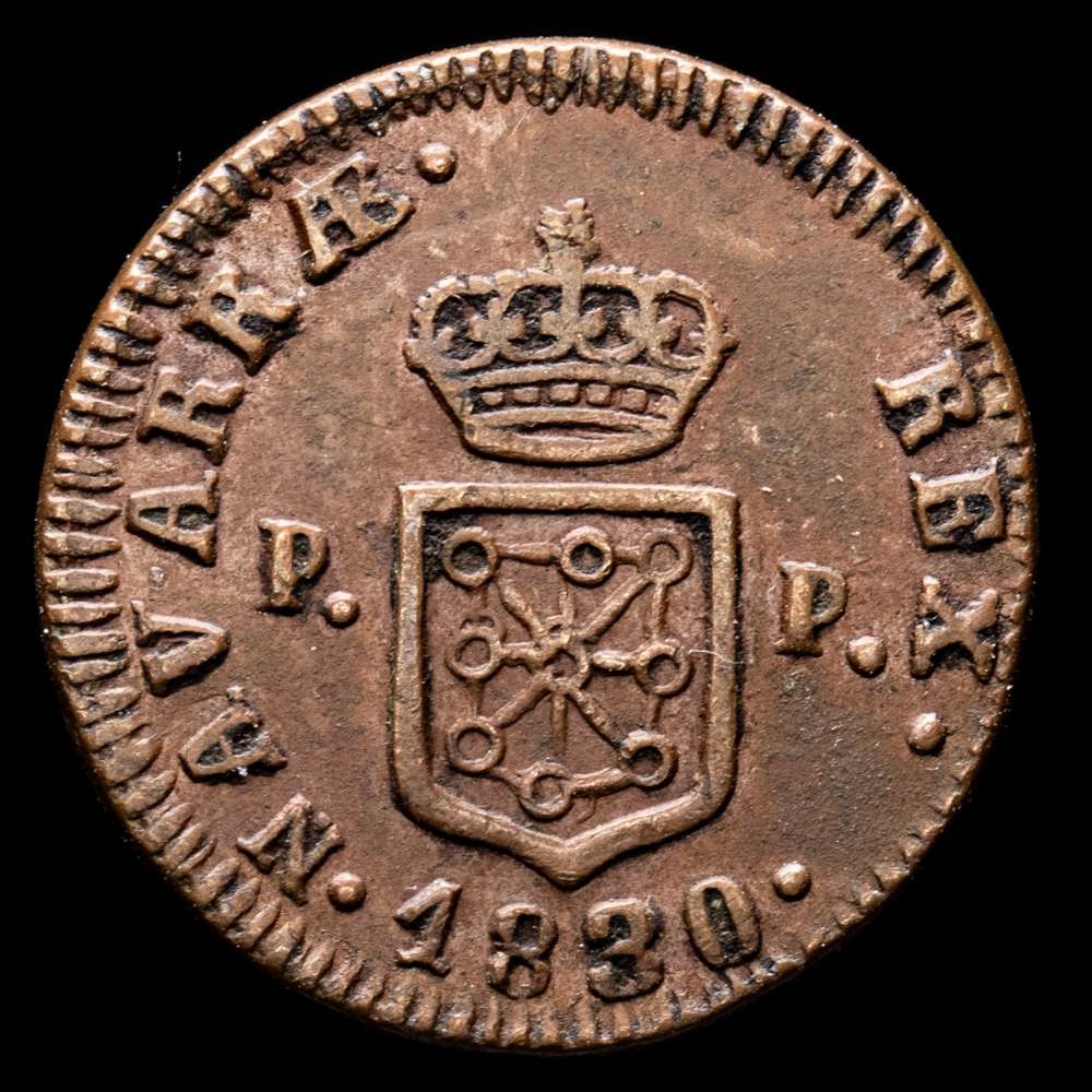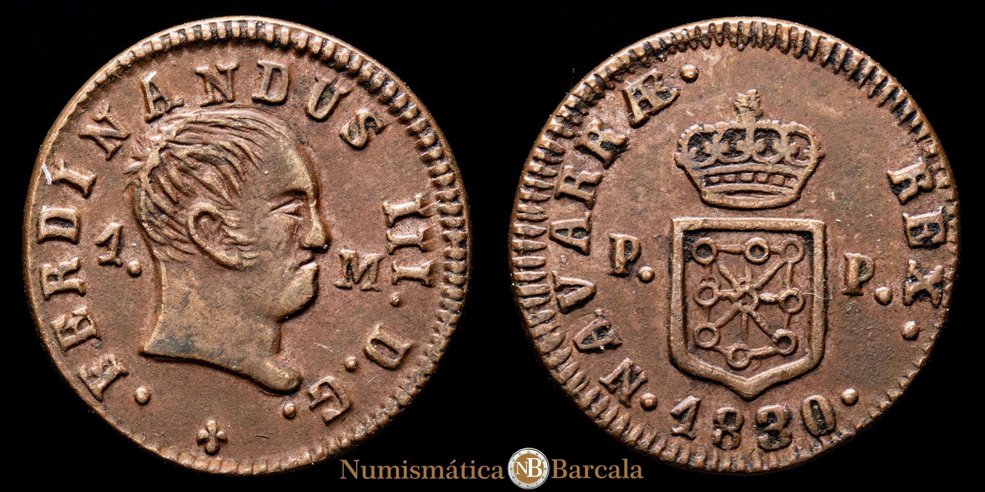 Fernando VII (1808-1833). 1 maravedí. 1830. Pamplona. (Cal-39). (Ros-4.11.28). Ae. 2,33 gramos. Busto desnudo. Buen ejemplar. Escasa en esta conservación. EBC-.