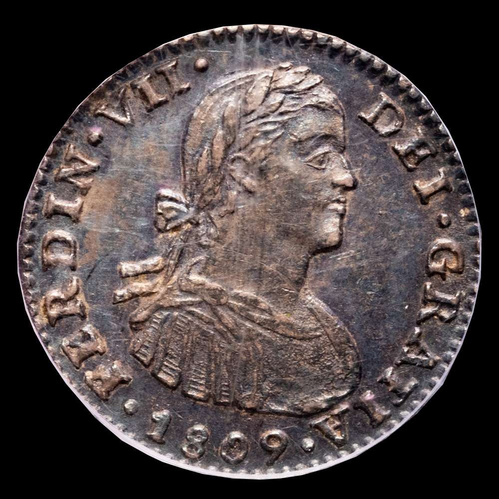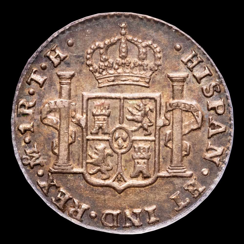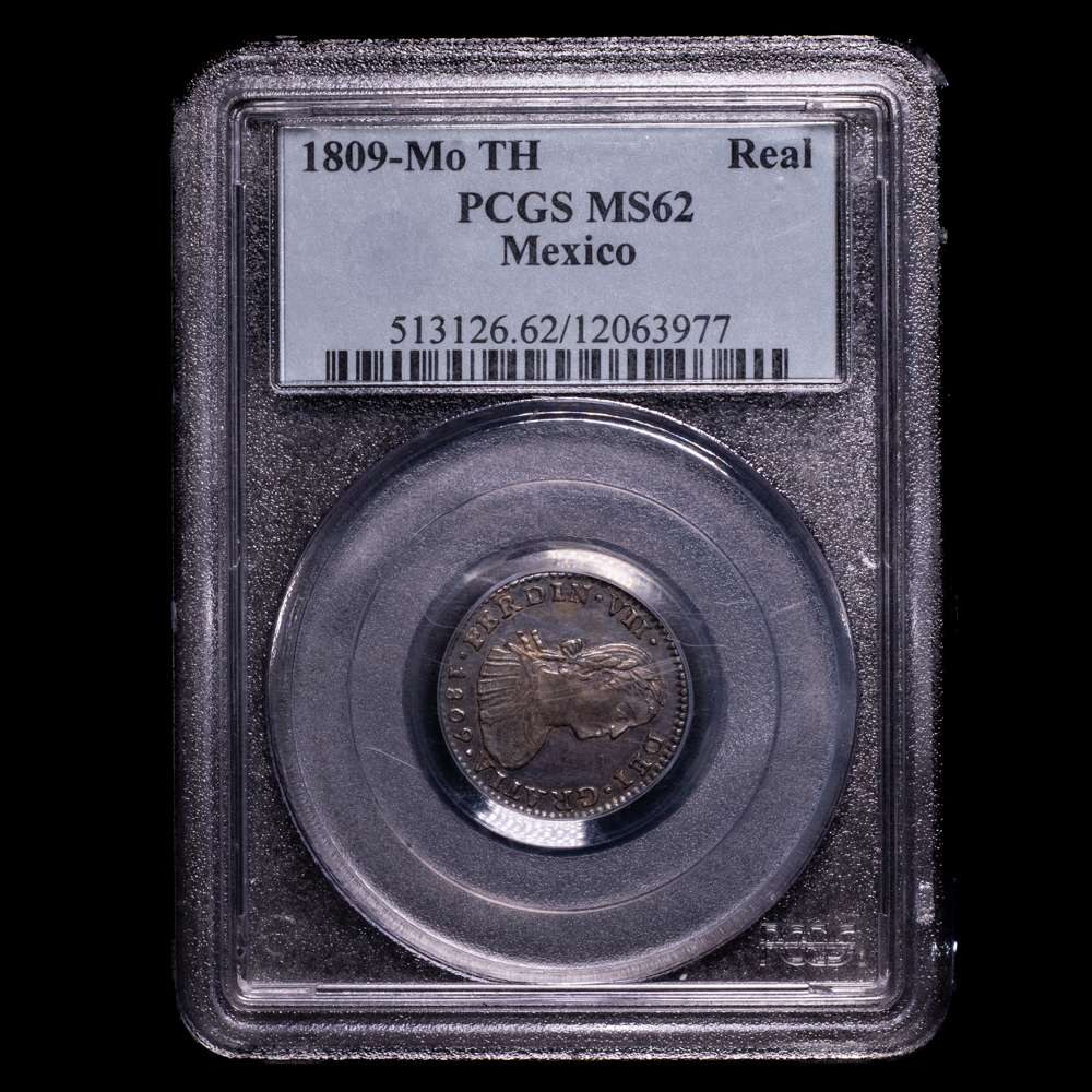 Fernando VII (1808-1833). 1 real. 1809. México. TH. (Cal-600). Ag. Bonita pátina. Escasa en esta conservación. Encapsulada por PCGS como MS 62. Algunos arañazos en la cápsula.