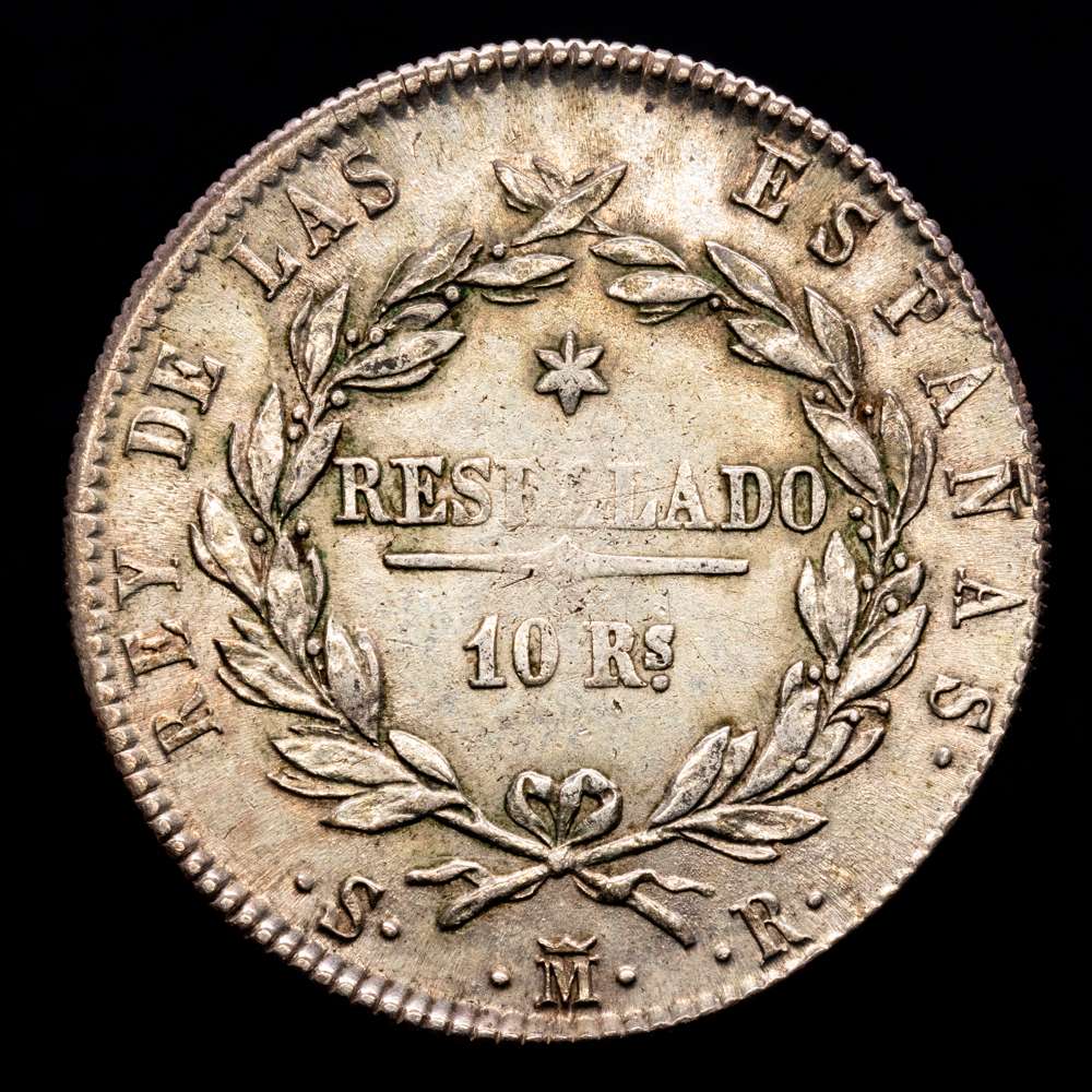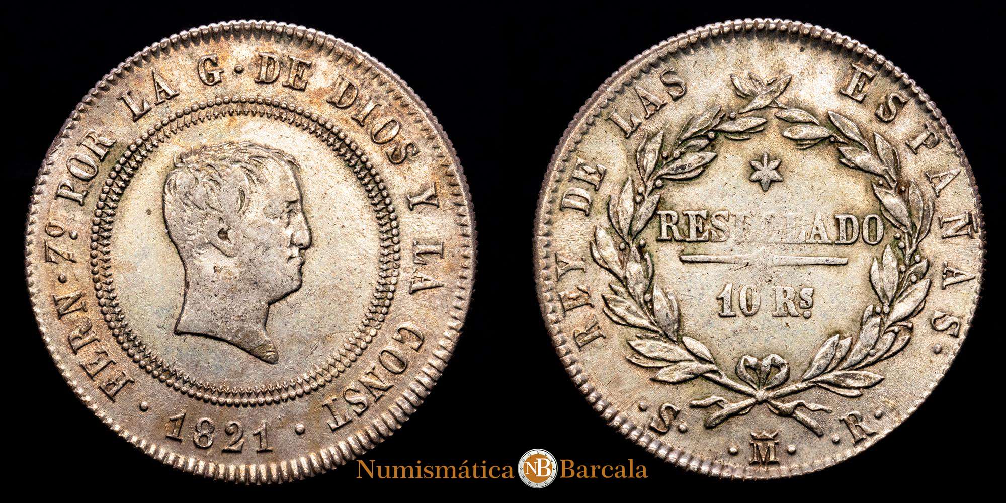 Fernando VII (1808-1833). 10 reales. 1821. Madrid. SR. (Cal-1088). Ag. 13,35 g. Tipo “Cabezón”. Módulo de 4 reales. Buen ejemplar para este tipo. Bonita pátina. Escasa así. MBC+/EBC-.