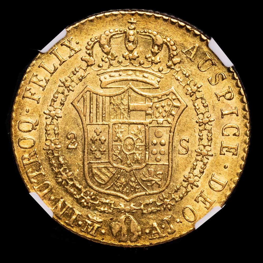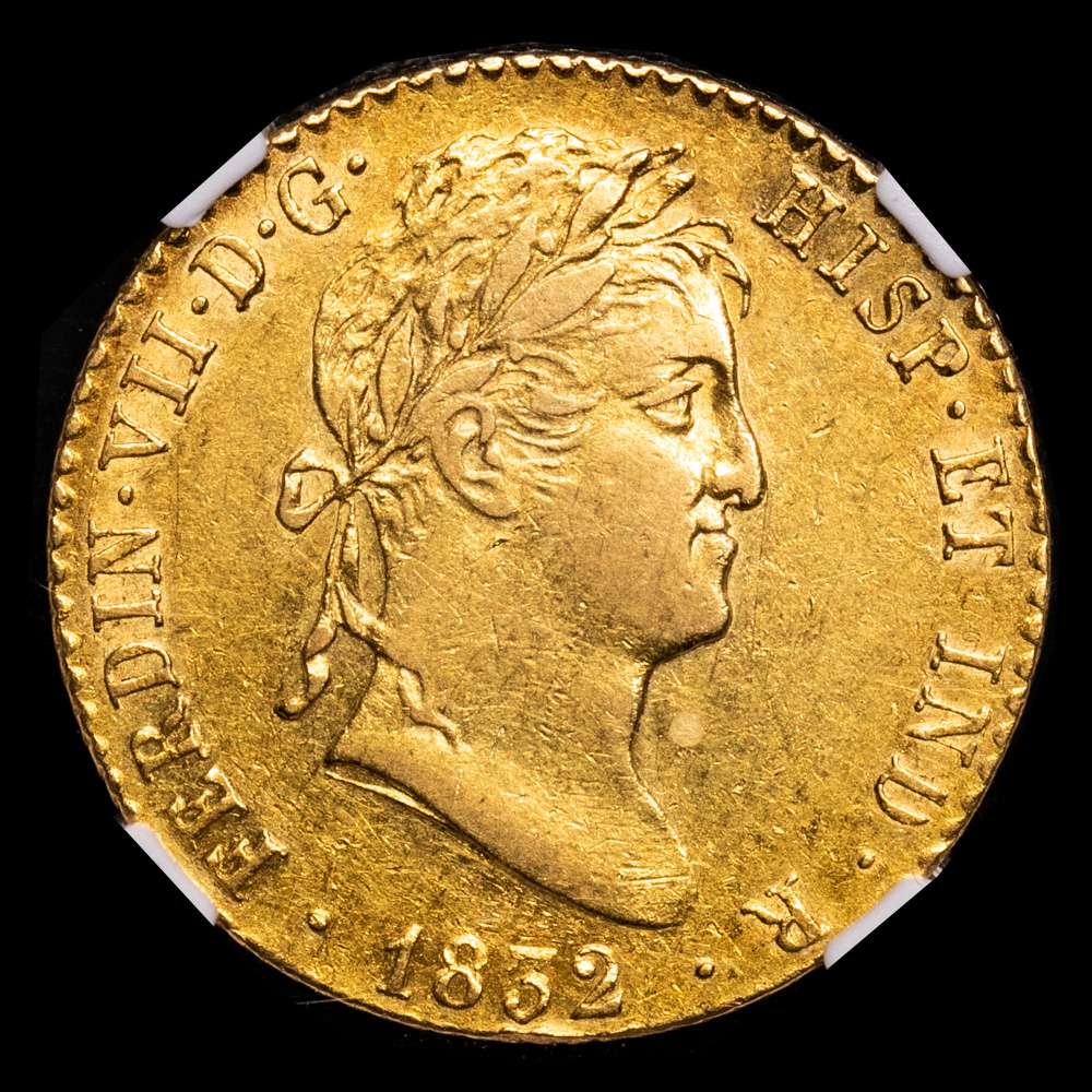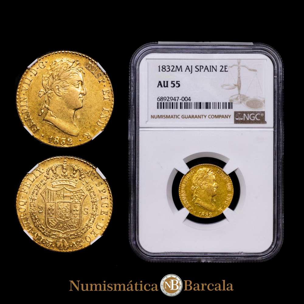 Numismática Barcala > Productos > Fernando VII (1808-1833). 2 escudos. 1832. Madrid. AJ. (Cal-1639). Au. Parte de brillo original. Encapsulada por NGC como AU 55.