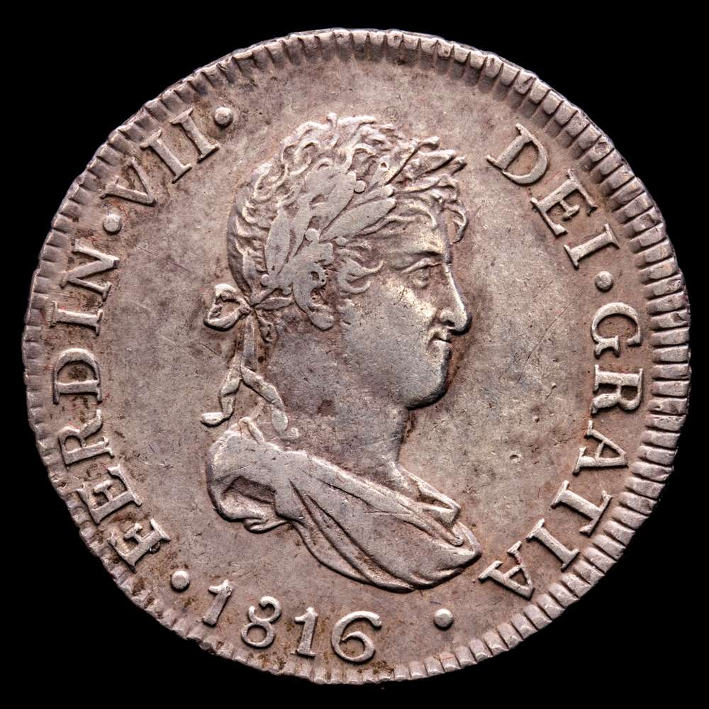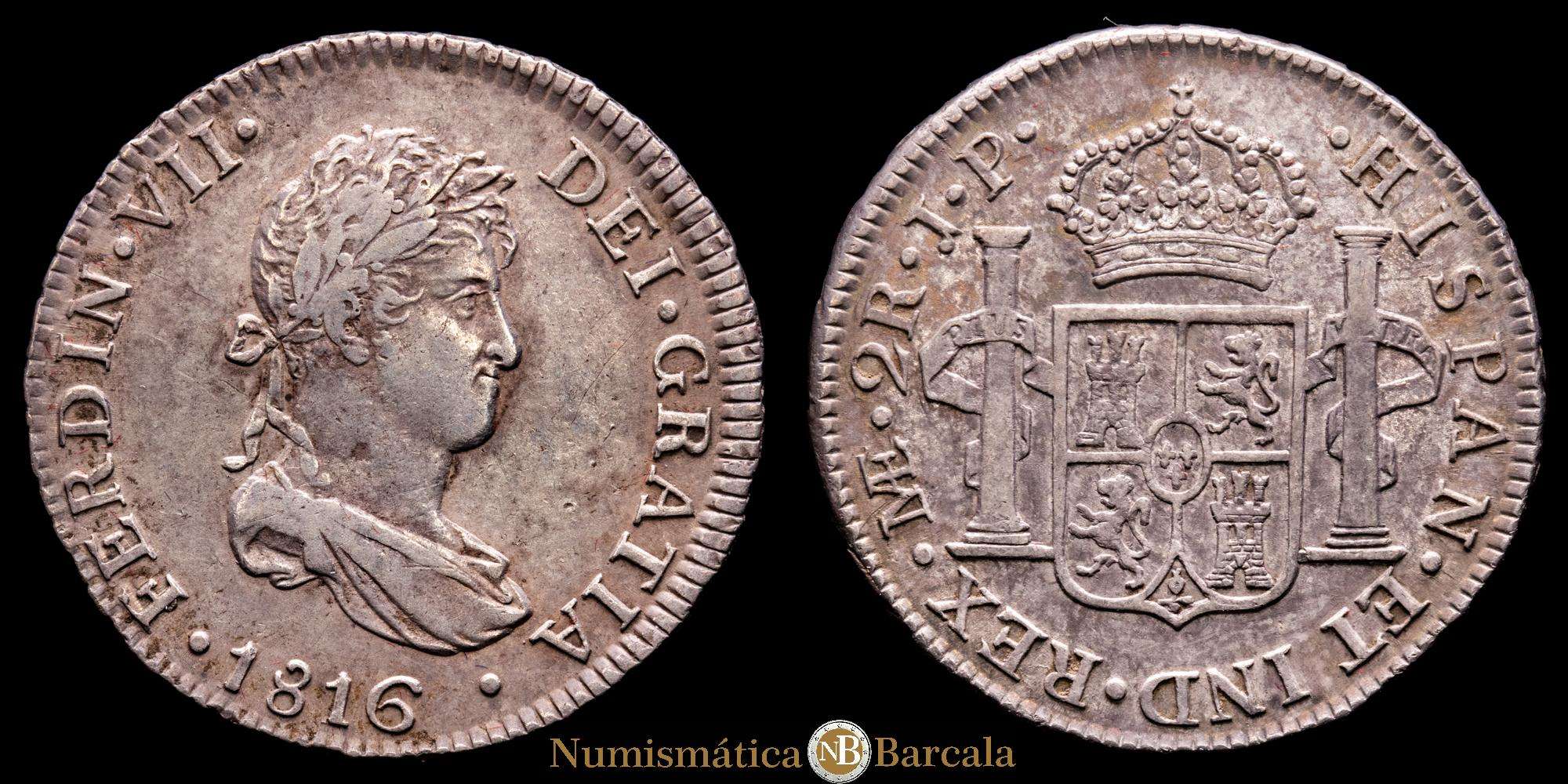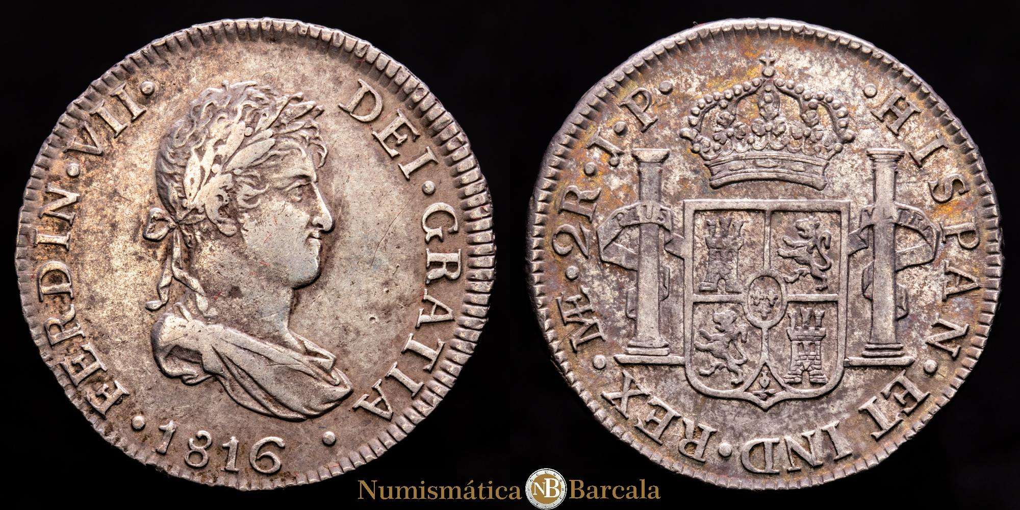 Fernando VII (1808-1833). 2 reales. 1816. Lima. JP. (Cal-816). Plata 6,52 g. Preciosa pátina. MBC+.