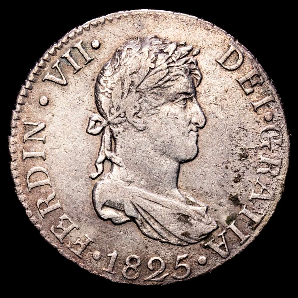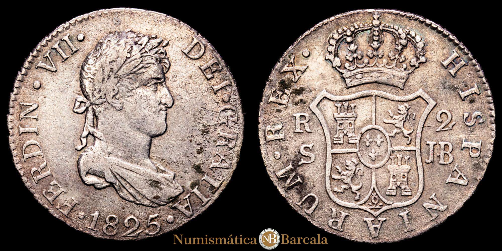 Fernando VII (1808-1833). 2 reales. 1825. Sevilla. JB. (Cal-1033). Ag. 5,88 gramos. MBC+.