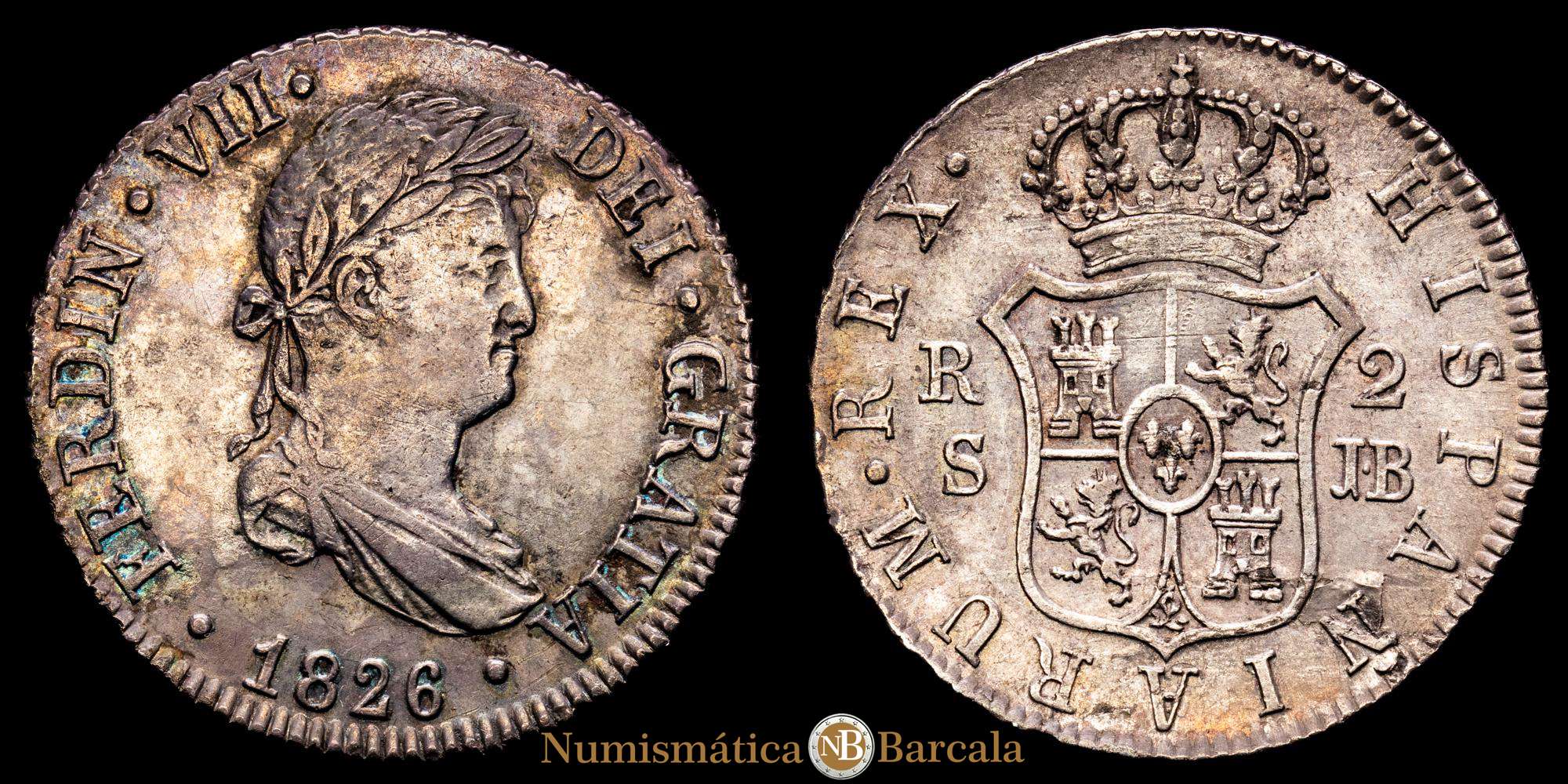 Numismática Barcala > Productos > Fernando VII (1808-1833) 2 reales. 1826. Sevilla. JB. (Cal-958). Ag. 5,98 gramos. Hojita en reverso. MBC+.