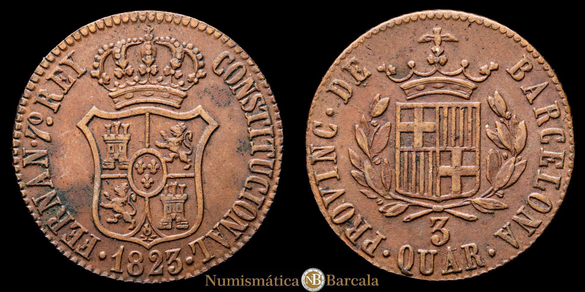 Numismática Barcala > Productos > Fernando VII (1808-1833). 3 cuartos. 1823. Cataluña. (Cal-15). Ae. 7,31 gramos. MBC+.