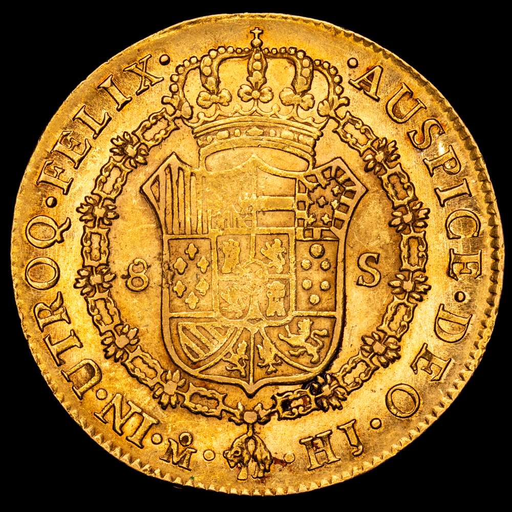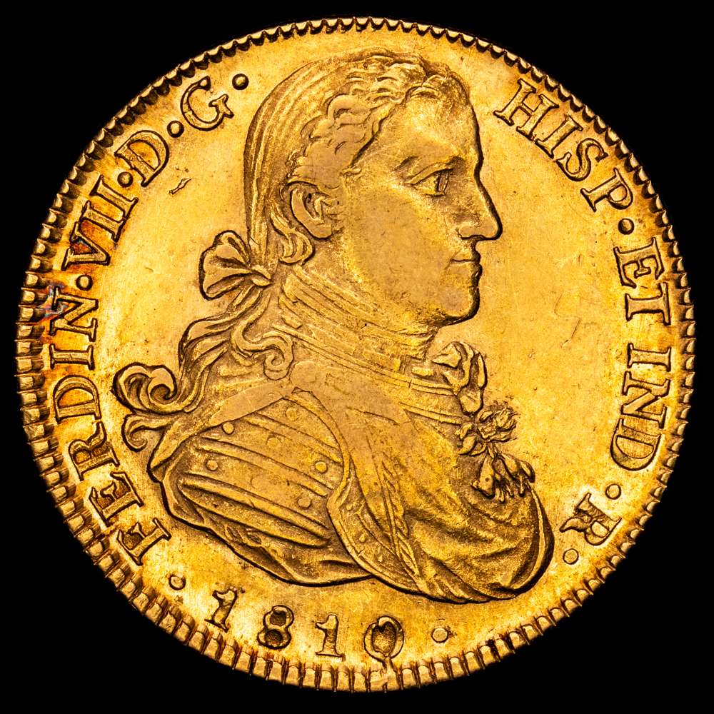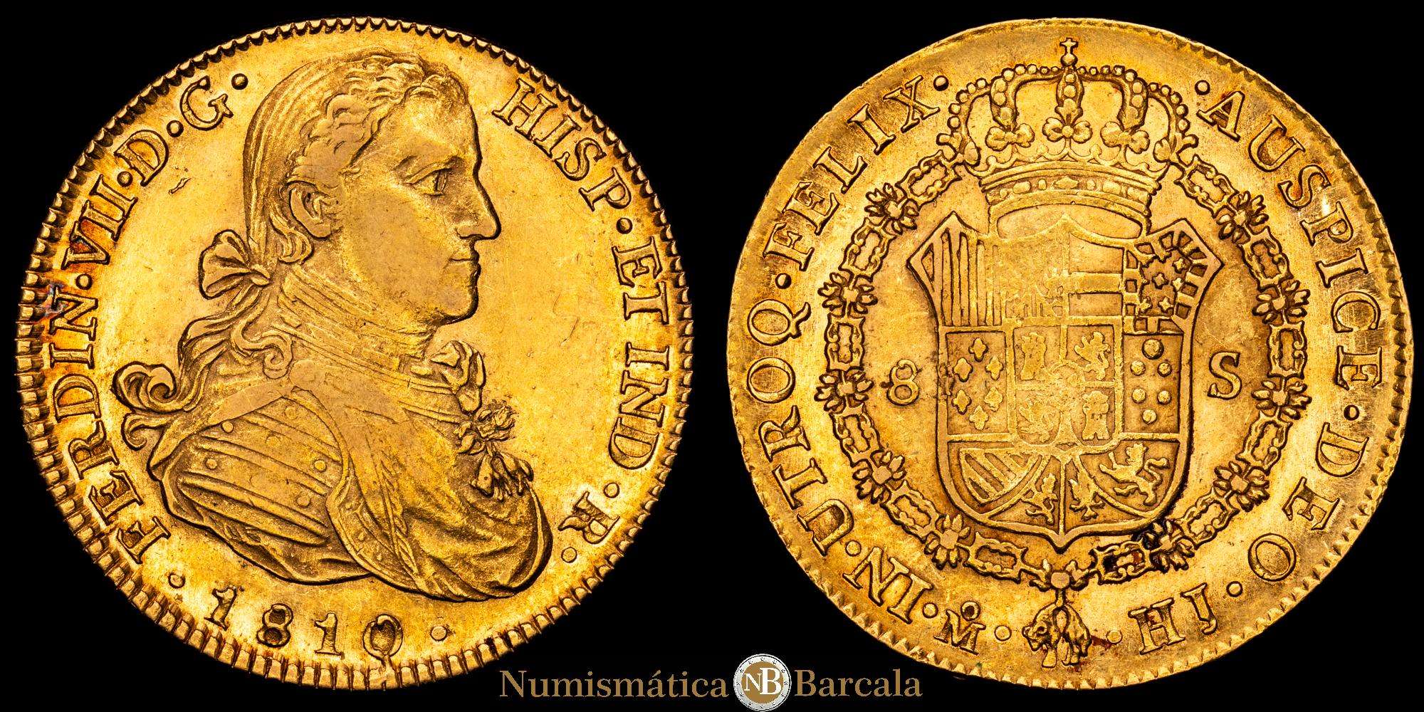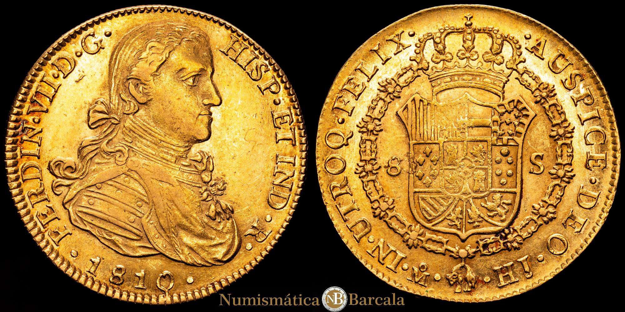 Fernando VII (1808-1833). 8 escudos. 1810. México. HJ. (Cal-1783). (Cal onza-1254). (27,01 g.). Au. Busto imaginario. Precioso color y brillo original. Bellísima. Rara así. EBC.