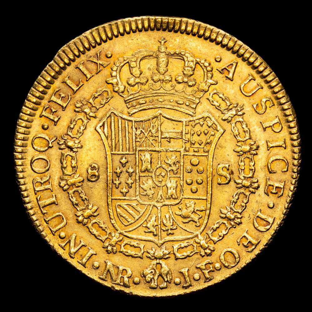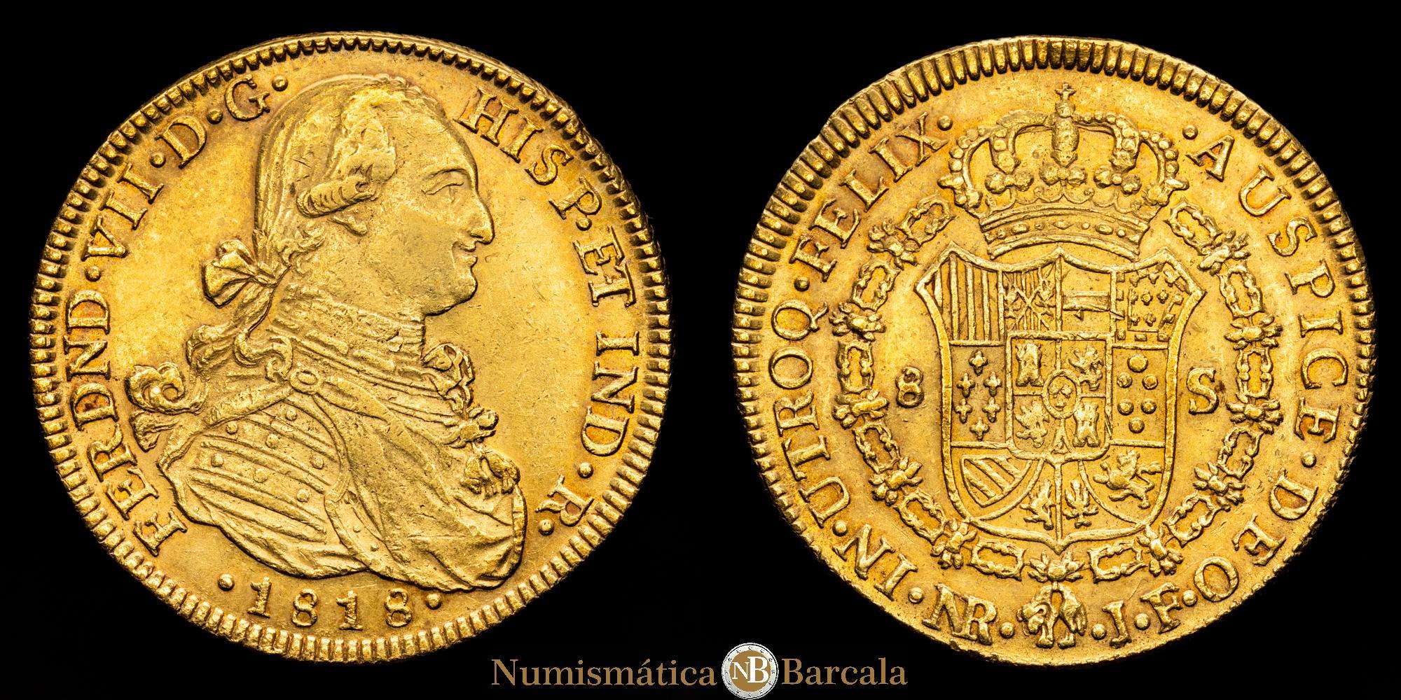 Fernando VII (1808-1833). 8 escudos. 1818. Santa Fe de Nuevo Reino. J.J. (Cal-1856). (Cal onza-1336). (Restrepo-127-28). Au. 27,01 gramos. Busto de Carlos IV. EBC-. Bonito color.