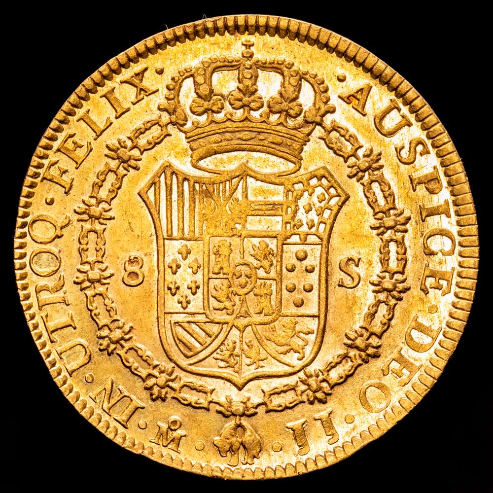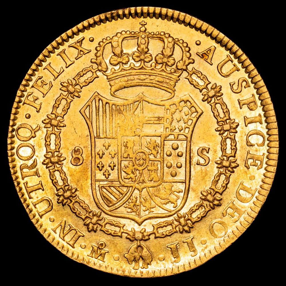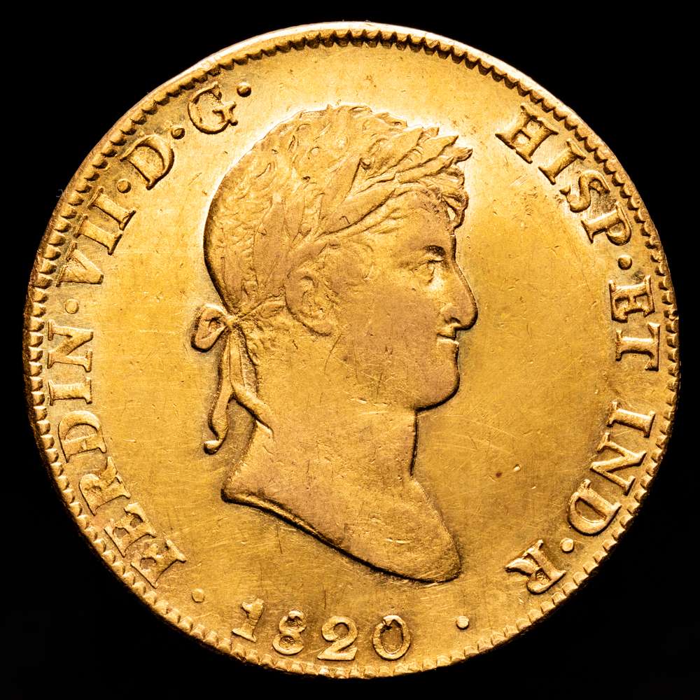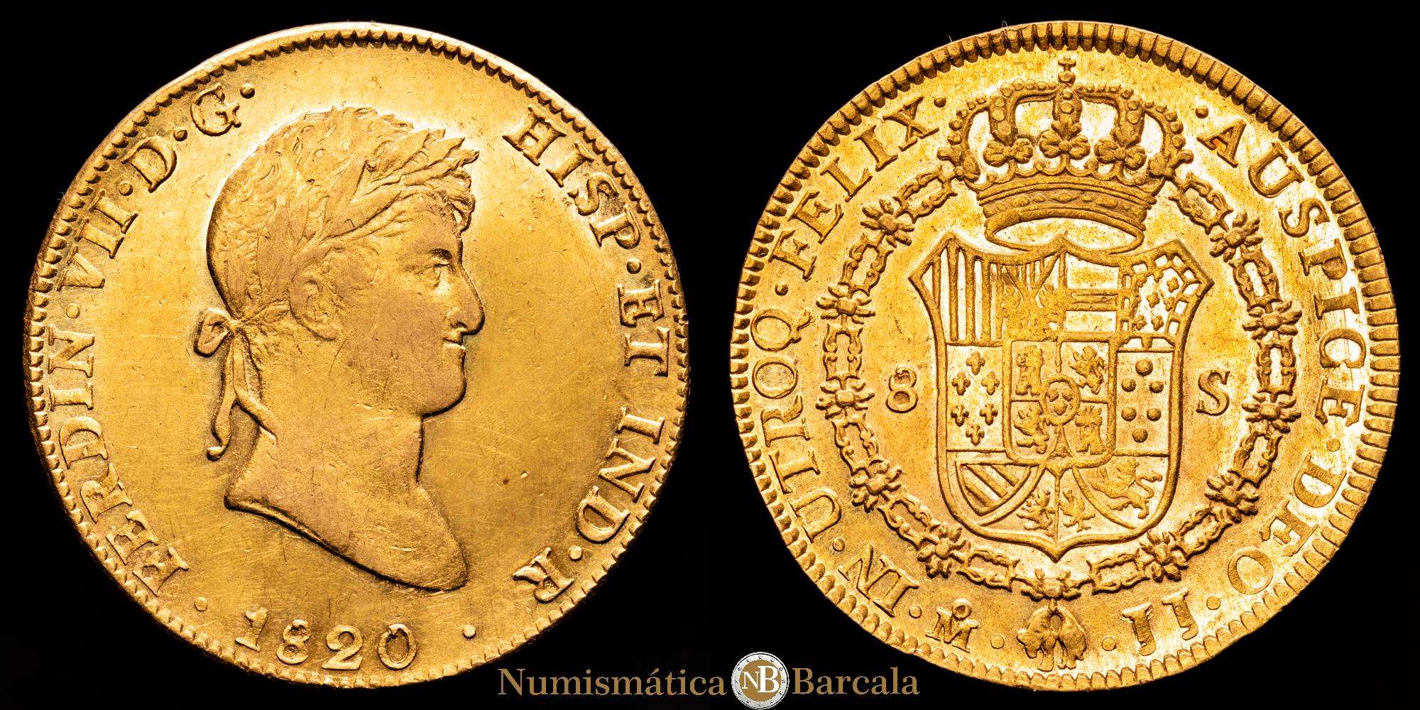 Fernando VII (1808-1833). 8 escudos. 1820. México. JJ. (Cal-1799). (Cal onza-1271). Au. 27,01 g. Levísimas suaves finas rayitas en anverso. Brillo original. EBC+/SC-.Rara en esta conservación. Buena acuñación.