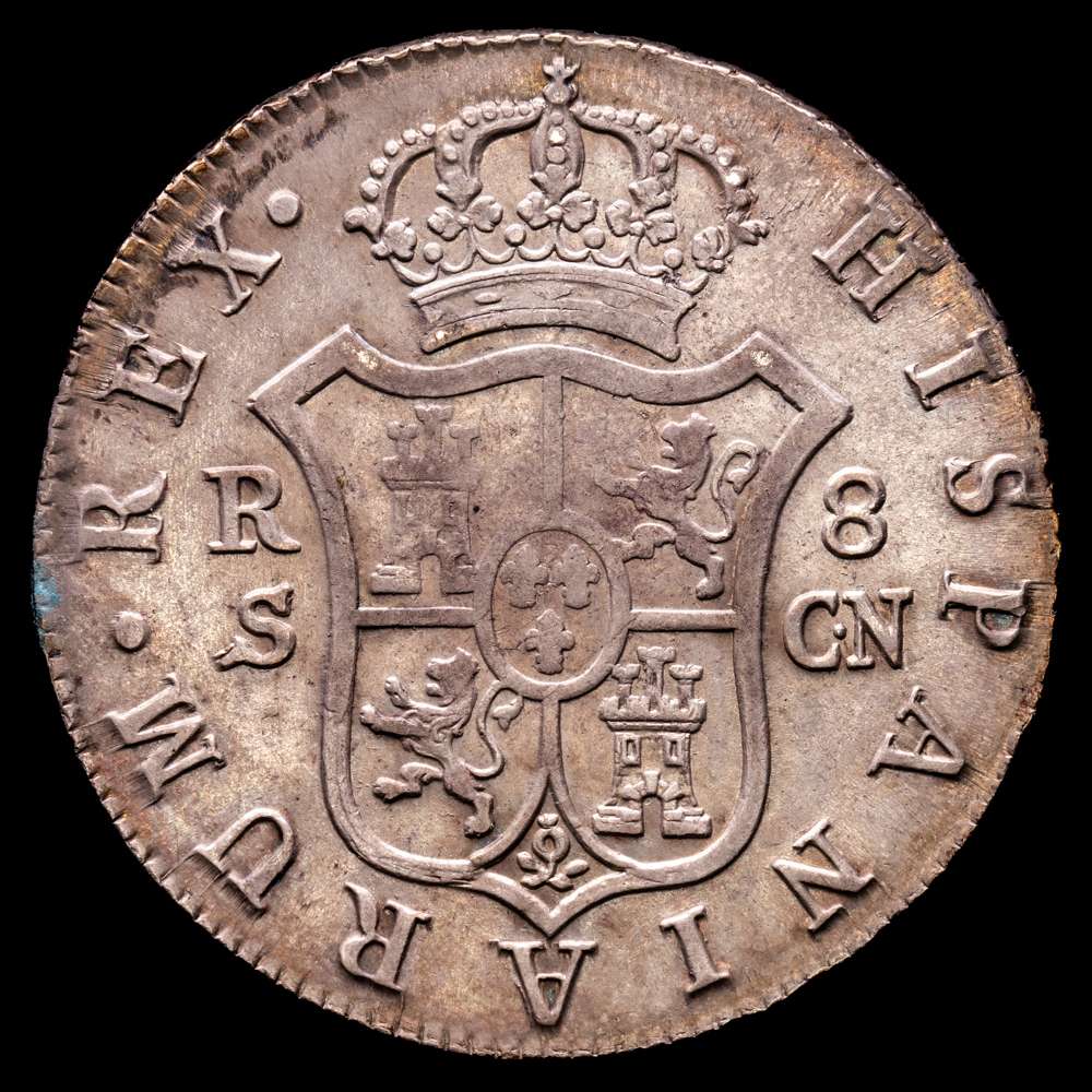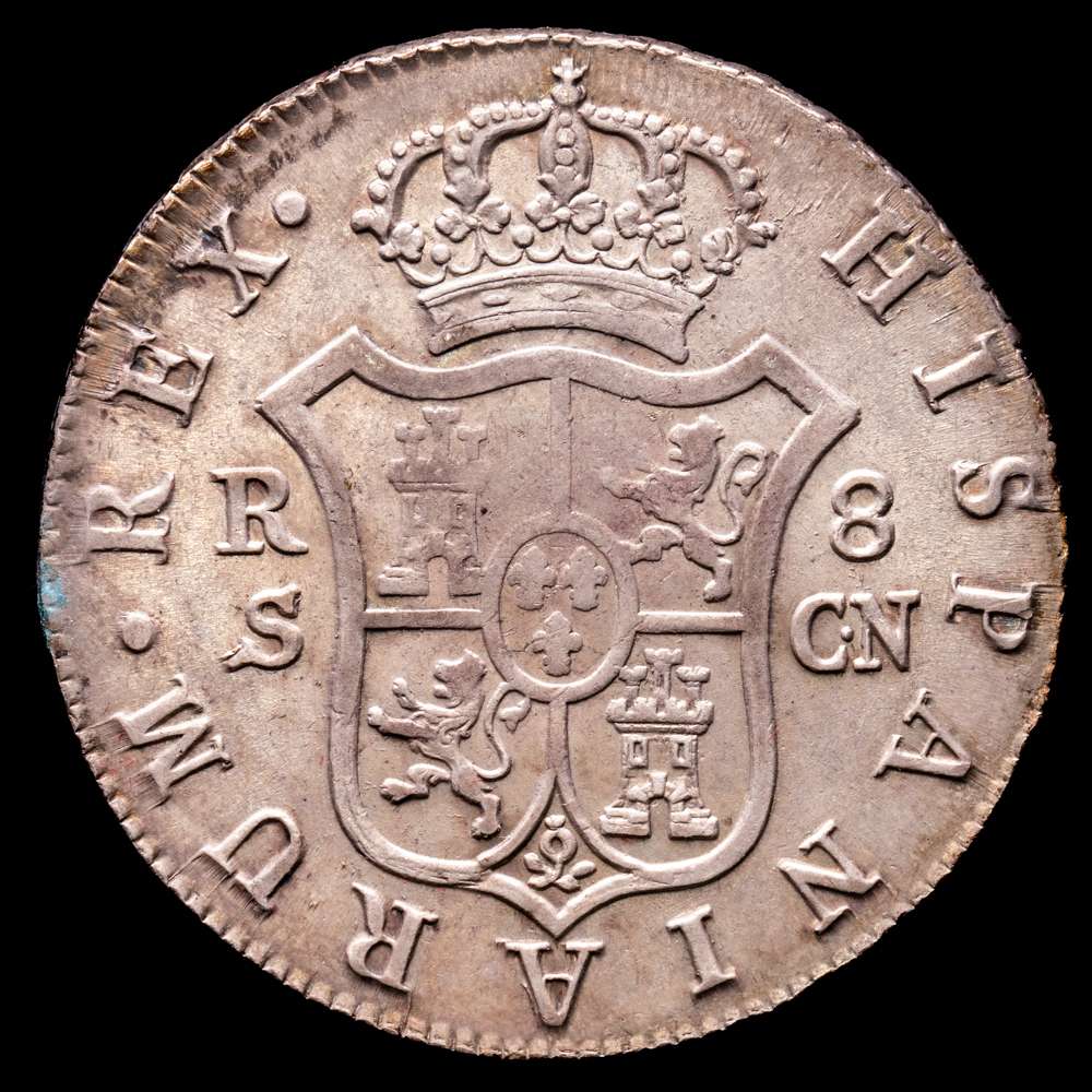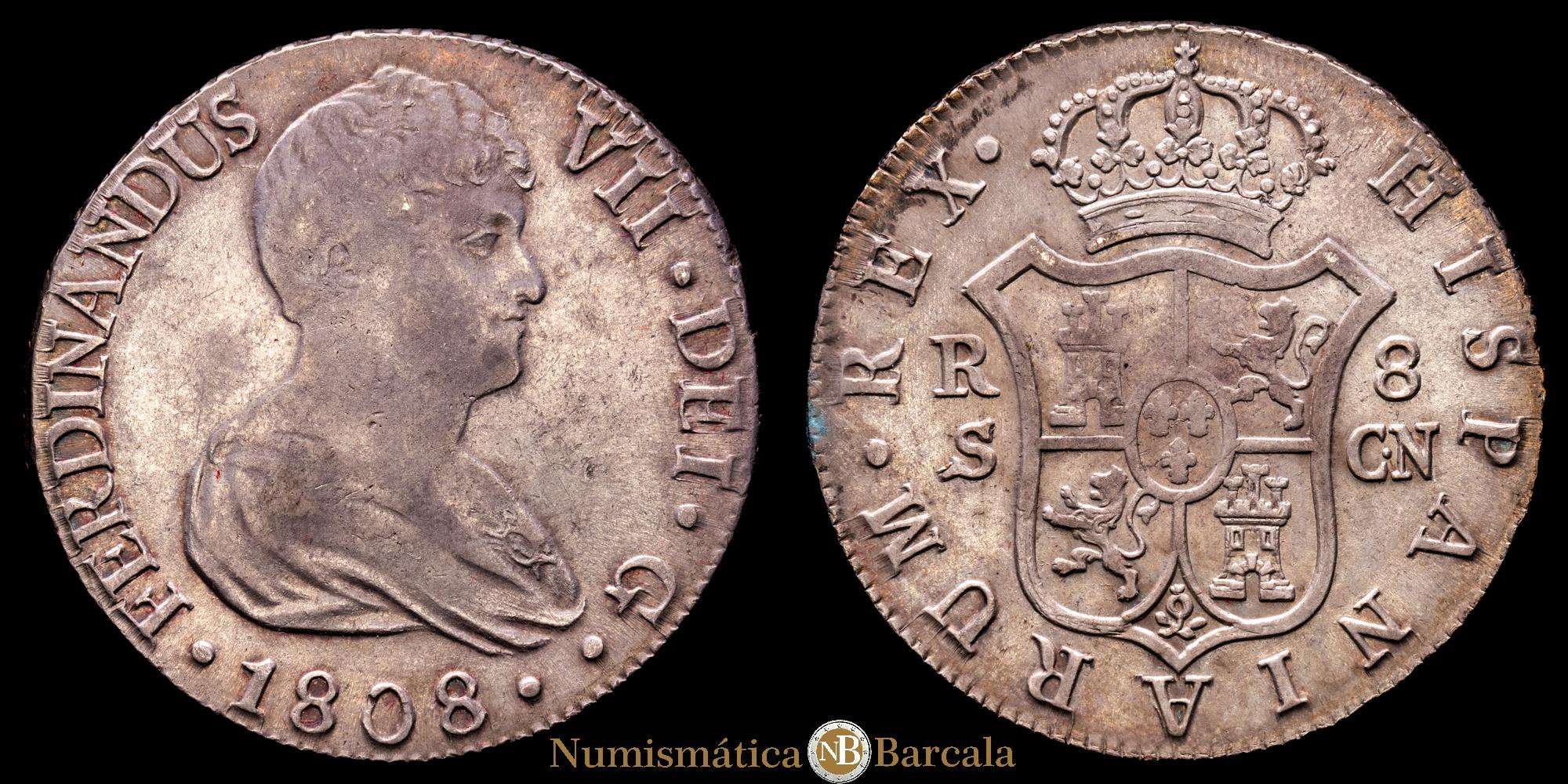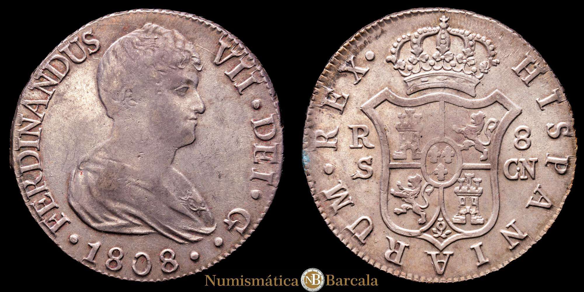 Numismática Barcala > Productos > Fernando VII (1808-1833). 8 reales. 1808. Sevilla. CN. (Cal-1411). Ag. 26,87 gramos. Tono. Busto desnudo. Escasa. MBC+.