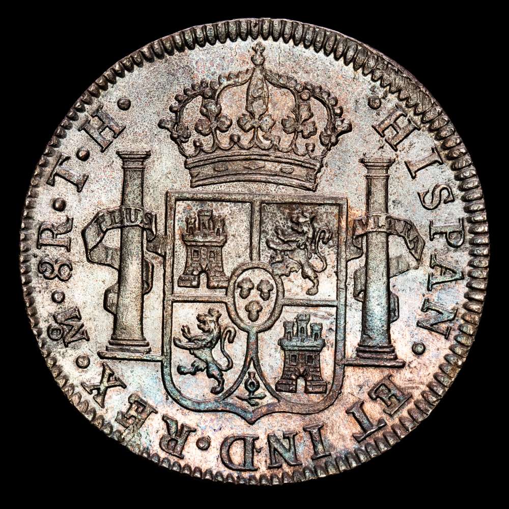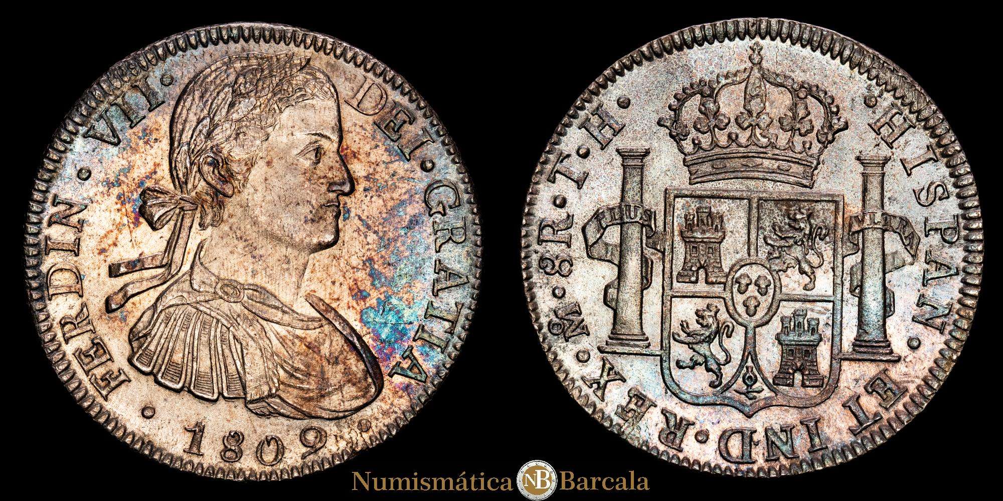 Fernando VII (1808-1833). 8 reales. 1809. México. TH. (Cal-1308). 27,02 g. Ag. Busto imaginario. Precioso ejemplar con un tono increíble y brillo subyacente. Sin vanos de acuñación ni marcas de desgaste y con un excelente atractivo visual. Poco común en esta conservación. UNC-.