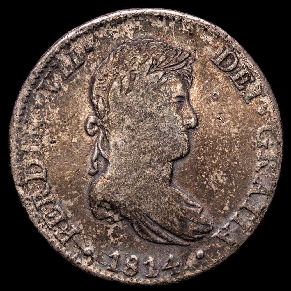 Fernando VII (1808-1833). 8 reales. 1814. Zacatecas. AG. (Cal-1454). Ag. 25,29 gramos. Debilidad habitual en el área central, fecha clara, pátina oscura. Muy escasa.