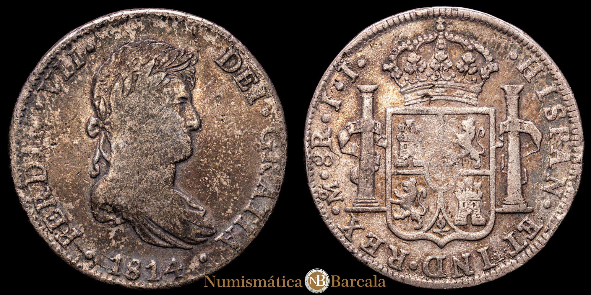Numismática Barcala > Productos > Fernando VII (1808-1833). 8 reales. 1814. México. J.J. (Cal-1326). Ag. 26,71 gramos. Pátina oscura. MBC+.
