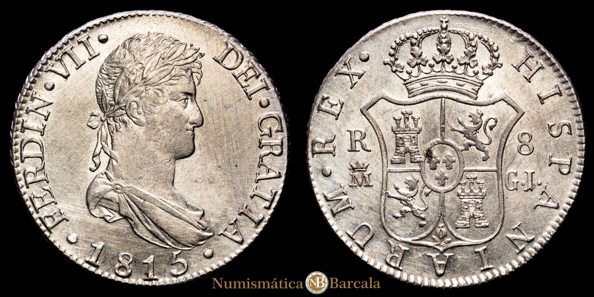 Fernando VII (1808-1833). 8 reales. 1815. Madrid. GJ. (Cal-1269). Ag. 27,20 g. Rayas superficiales. Restos de brillo original. Escasa así. EBC