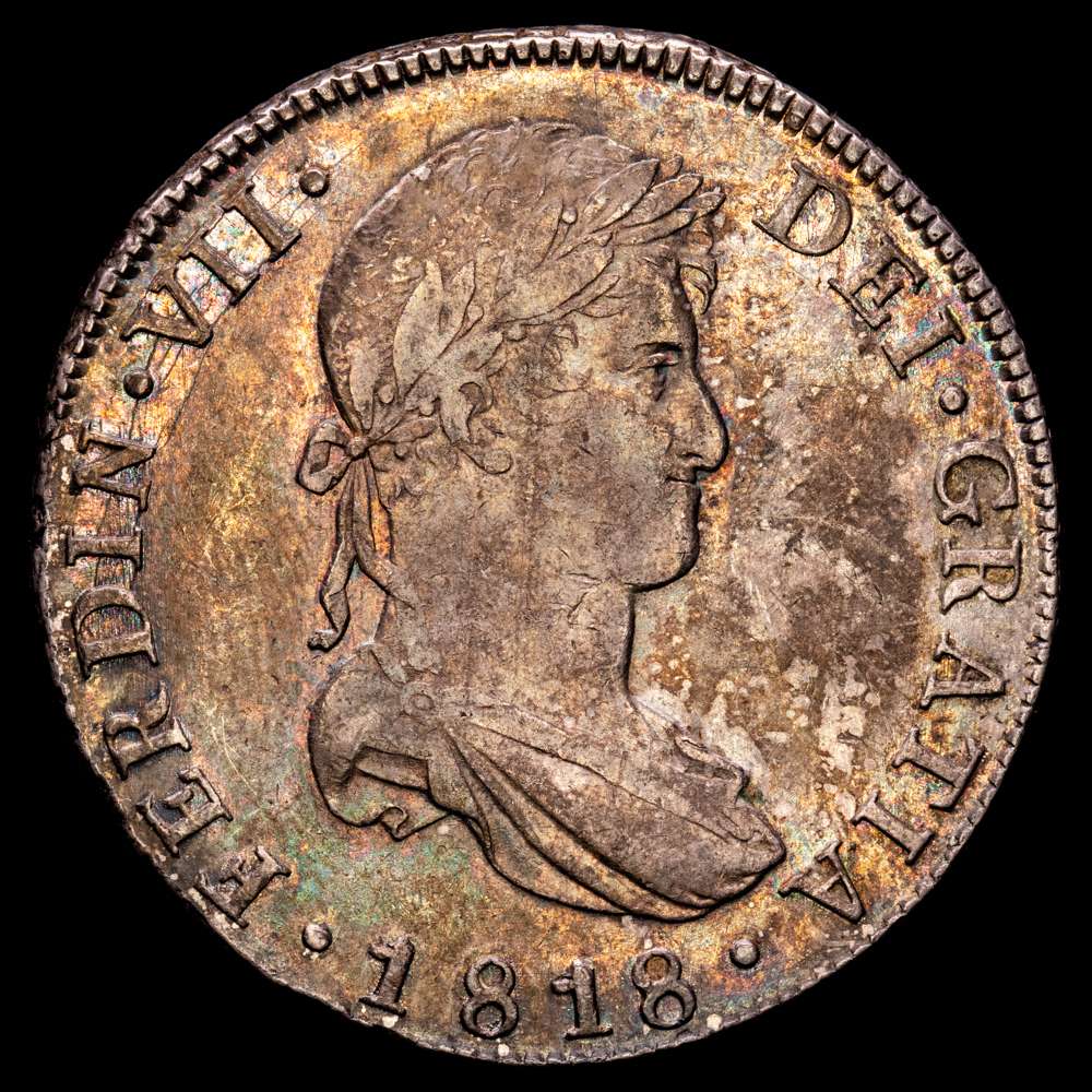 Fernando VII (1808-1833). 8 reales. 1818. Guatemala. M. (Cal-1233). Ag. 26,95 g. Bella pátina irisada. Encapsulada por NGC como AU 55.