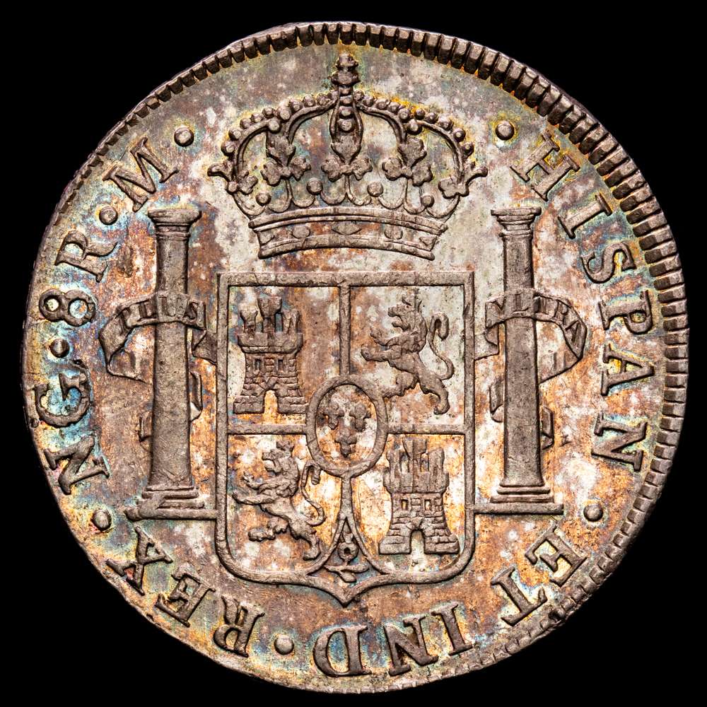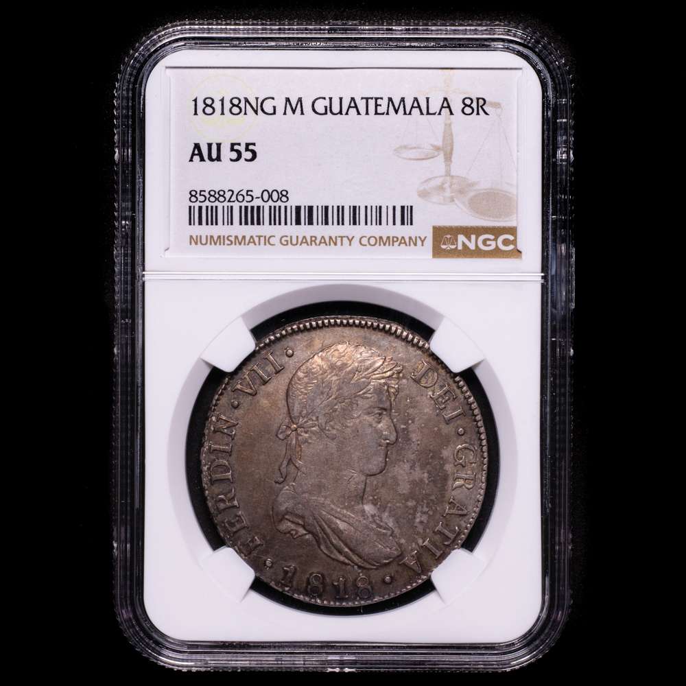 Numismática Barcala > Productos > Fernando VII (1808-1833). 8 reales. 1818. Guatemala. M. (Cal-1233). Ag. 26,95 g. Bella pátina irisada. Encapsulada por NGC como AU 55.