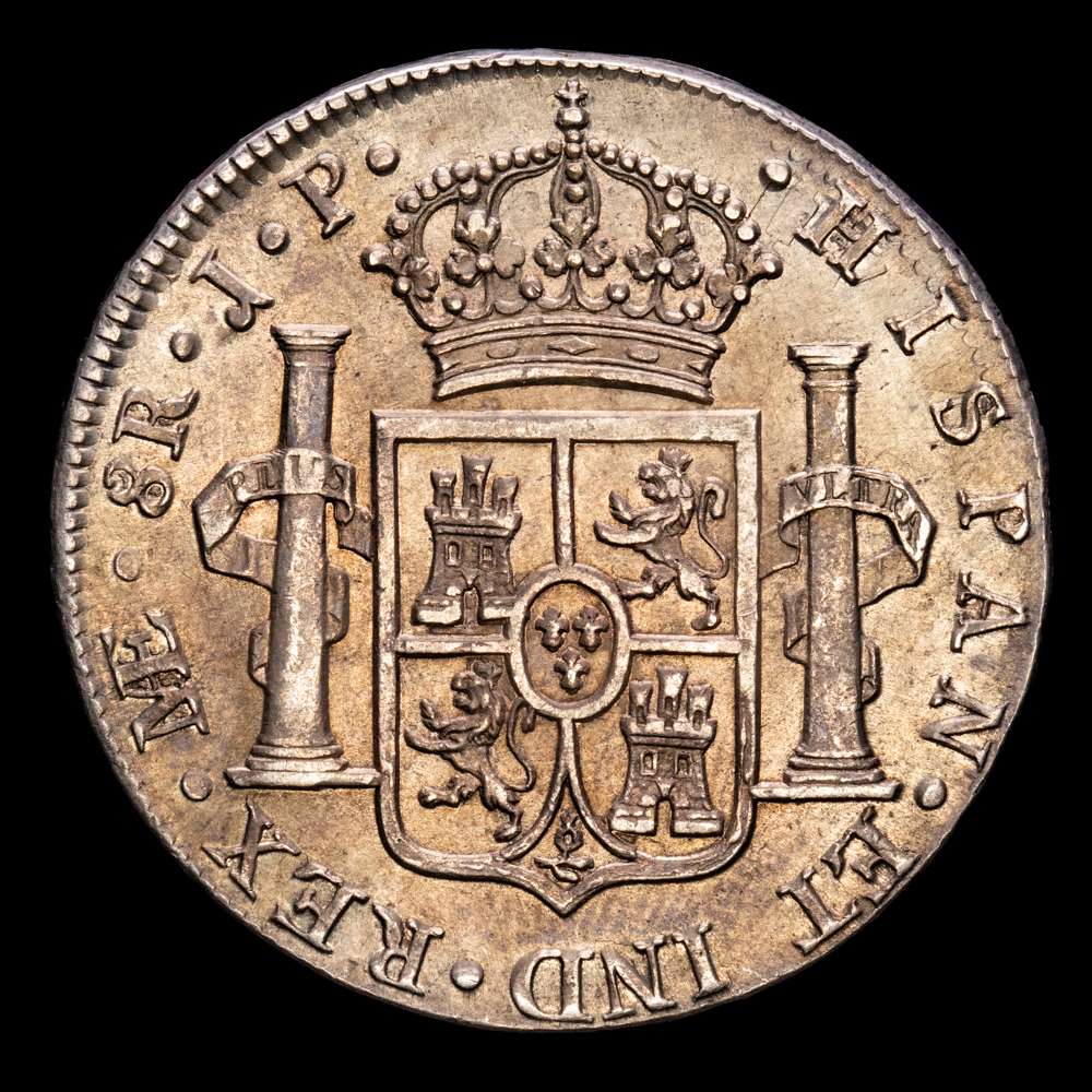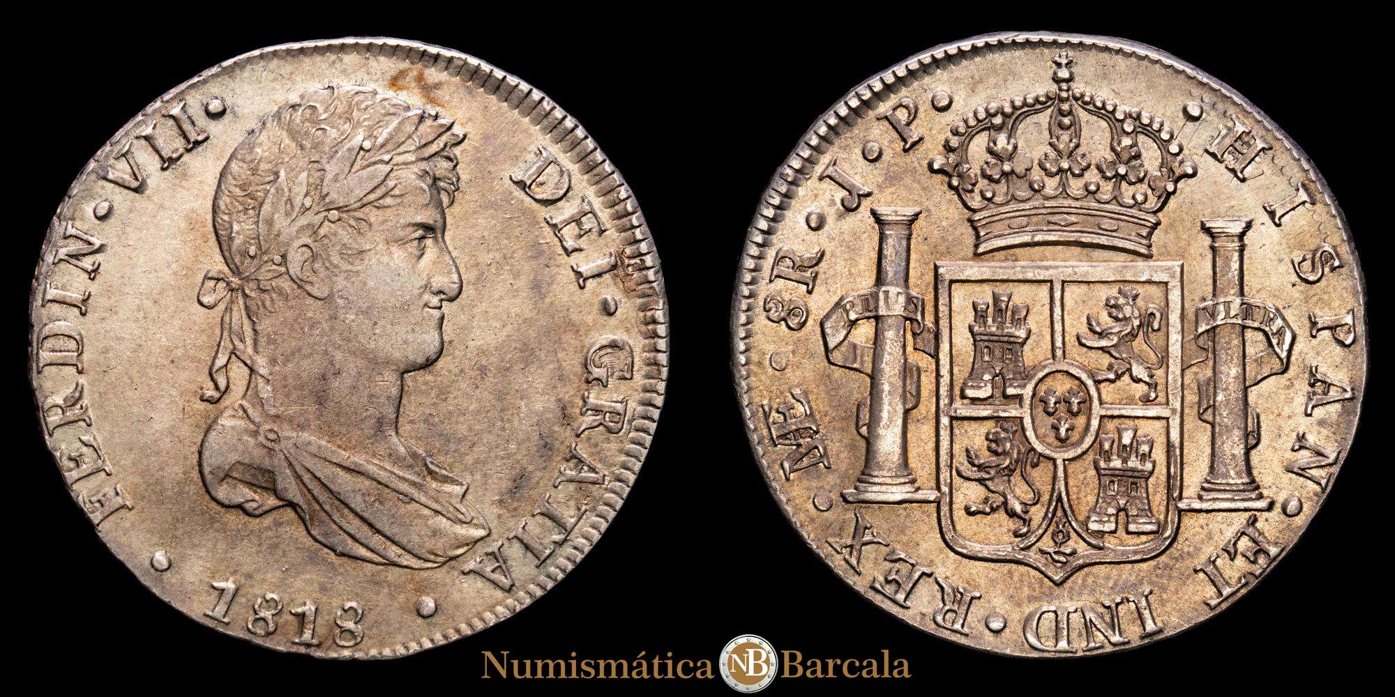 Fernando VII (1808-1833). 8 reales. 1818. Lima. J.P. (Cal-1251). Ag. 27,01 gramos. Pátina suave con tonos ligeros. Atractiva. Escasa así. EBC.