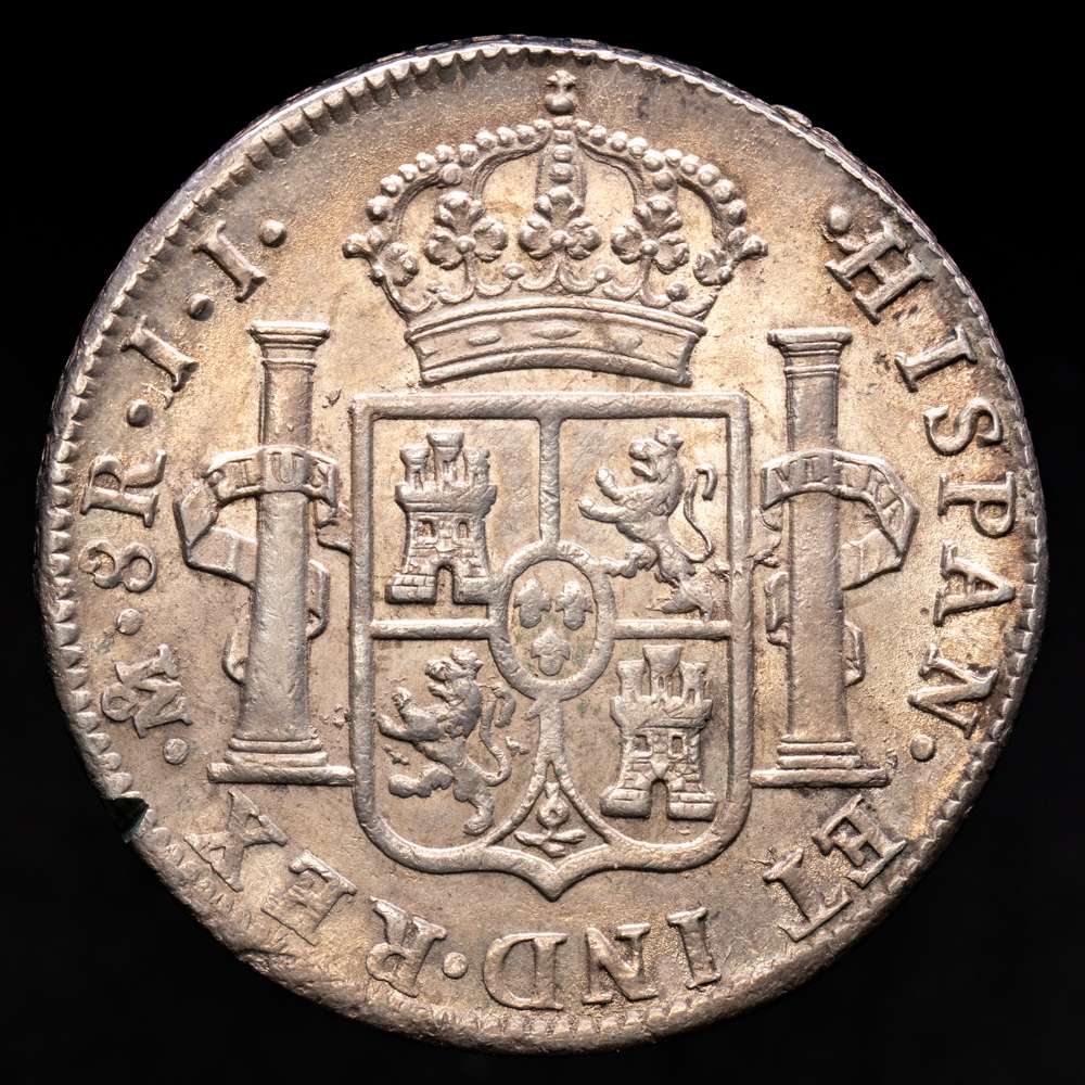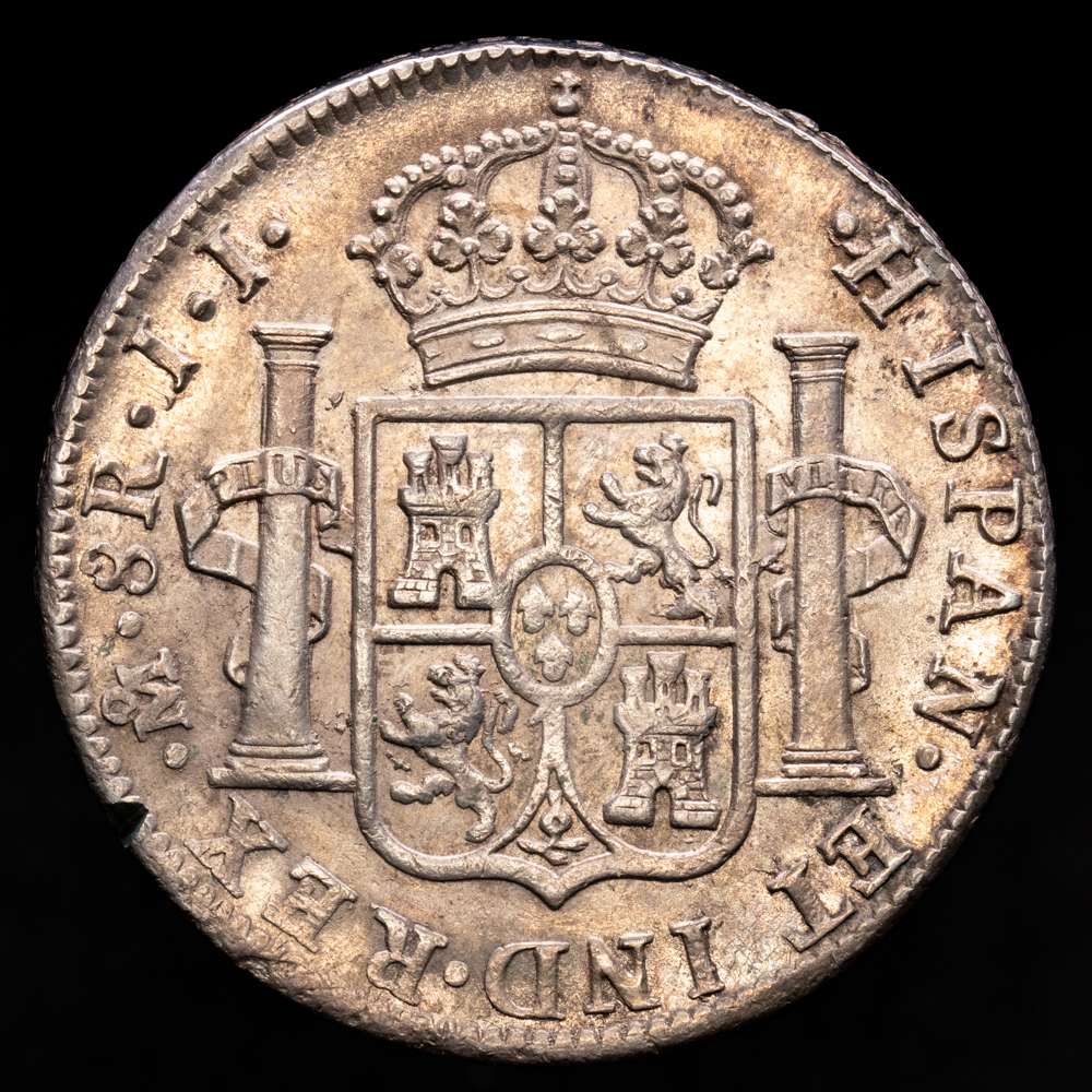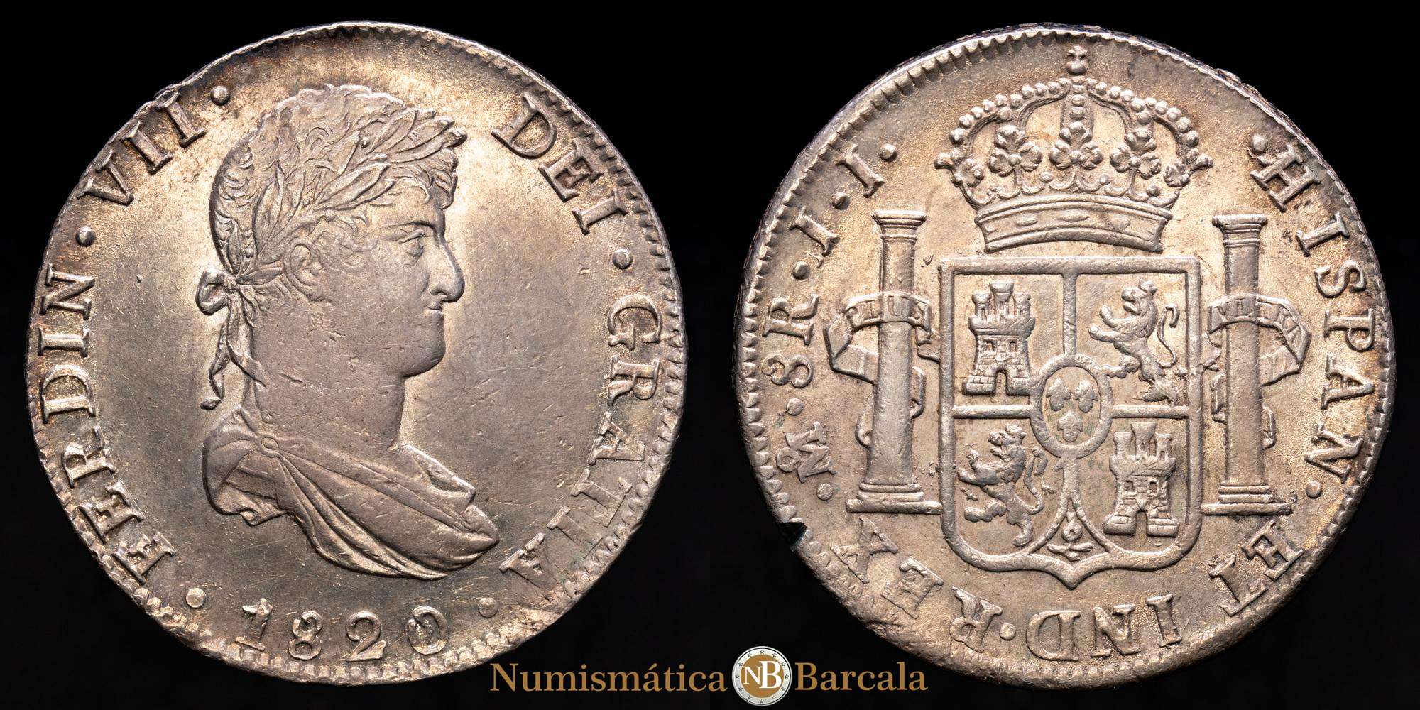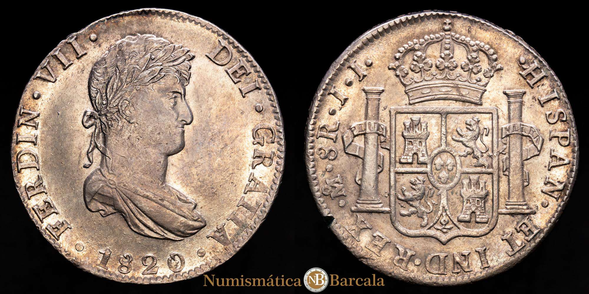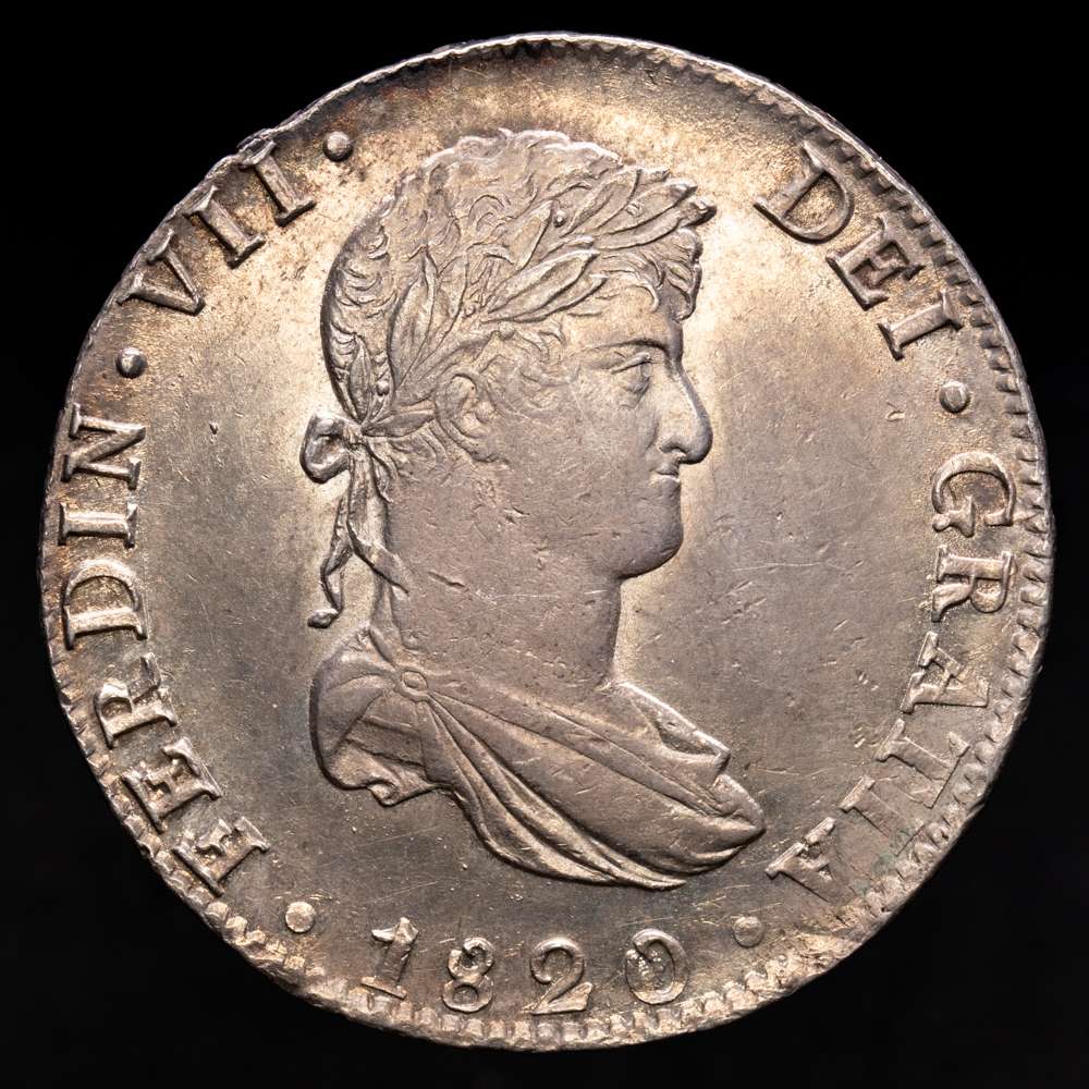 Fernando VII (1808-1833). 8 reales. 1820. México. JJ. (Cal-1336). Ag. 27,06 g. Bello tono. (Pequaña muesca en el canto visible en reverso). Buena acuñación con parte del brillo original. Atractivo. Raro en esta conservación. EBC+.