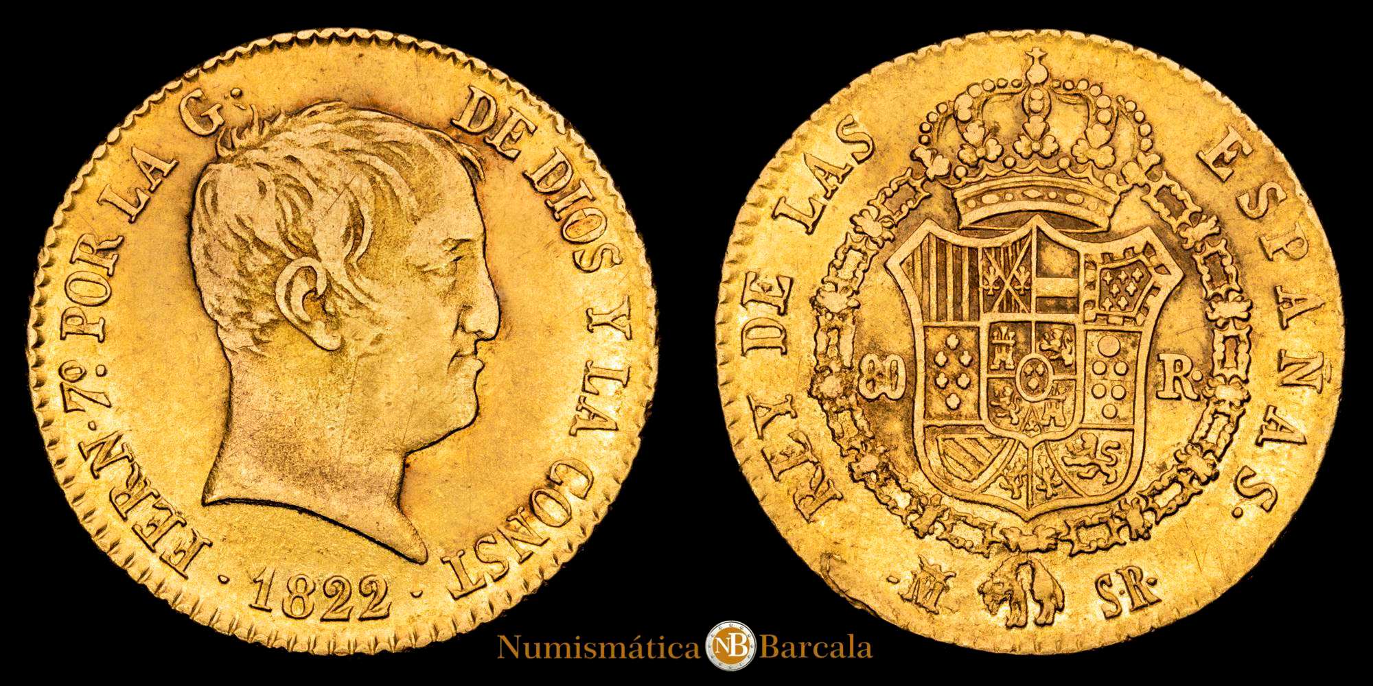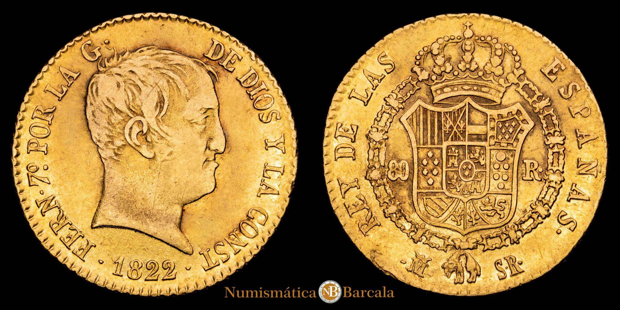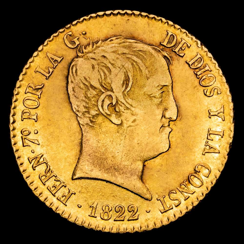 Fernando VII (1808-1833). 80 reales. 1822. Madrid. SR. (Cal-1641). Au. 6,75 gramos. Tipo “cabezón”. MBC+. Bonito color.