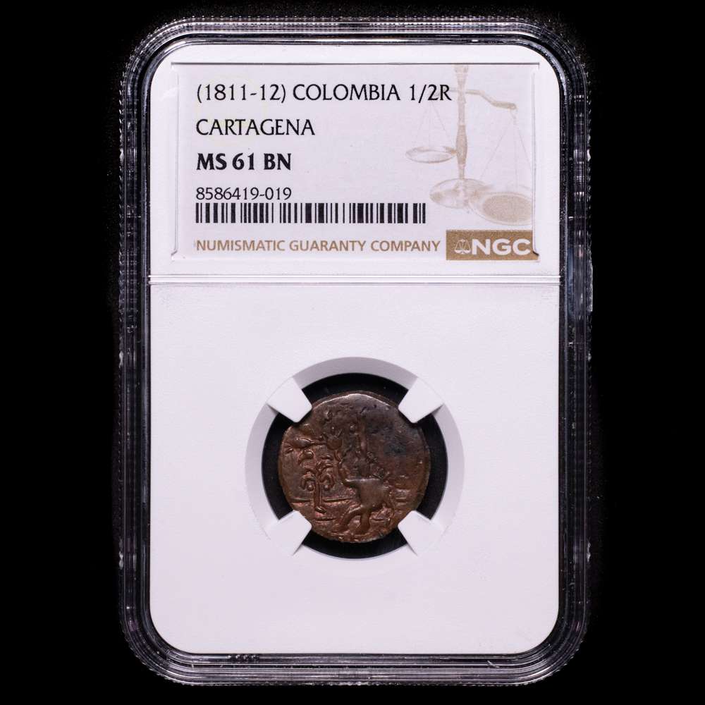 Cartagena, Colombia, Fernando VII (1808-1833). cobre 1/2 real, (1811-12), Encapsulada por NGC como MS 61 BN (Top Pop), el mejor ejemplar conservado en el censo de NGC. Restrepo-131.5; KM-D2; Cal-314. Acuñación fuerte y completa (rara así), los bordes toscos y el color oscuro como de costumbre, acuñada sin fecha en el diseño (típicamente atribuida a 1811 pero Restrepo dice que el escudo no fue aprobado hasta 1812).