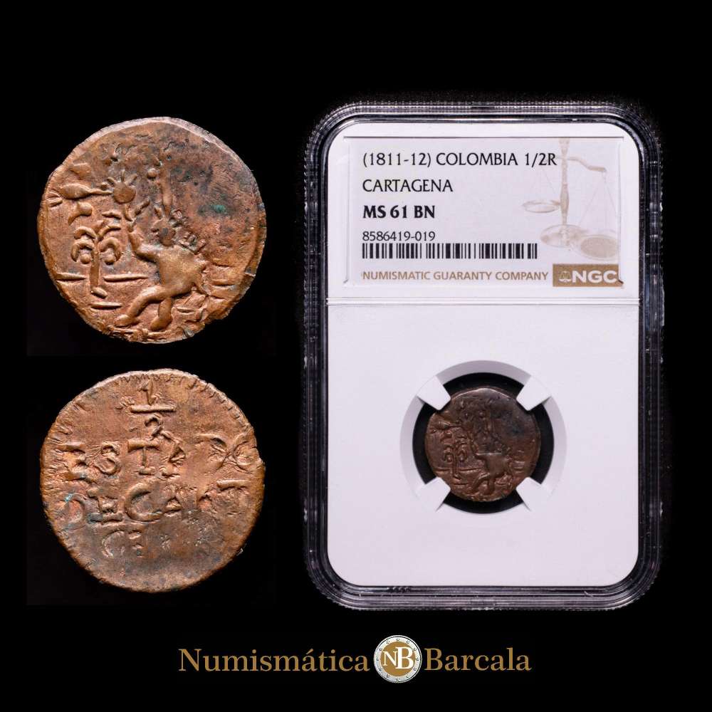 Numismática Barcala > Productos > Fernando VII (1808-1833). Cartagena, Colombia, Ae 1/2 real, (1811-12), Encapsulada por NGC como MS 61 BN (Top Pop), el mejor ejemplar conservado en el censo de NGC. Restrepo-131.5; KM-D2;.
