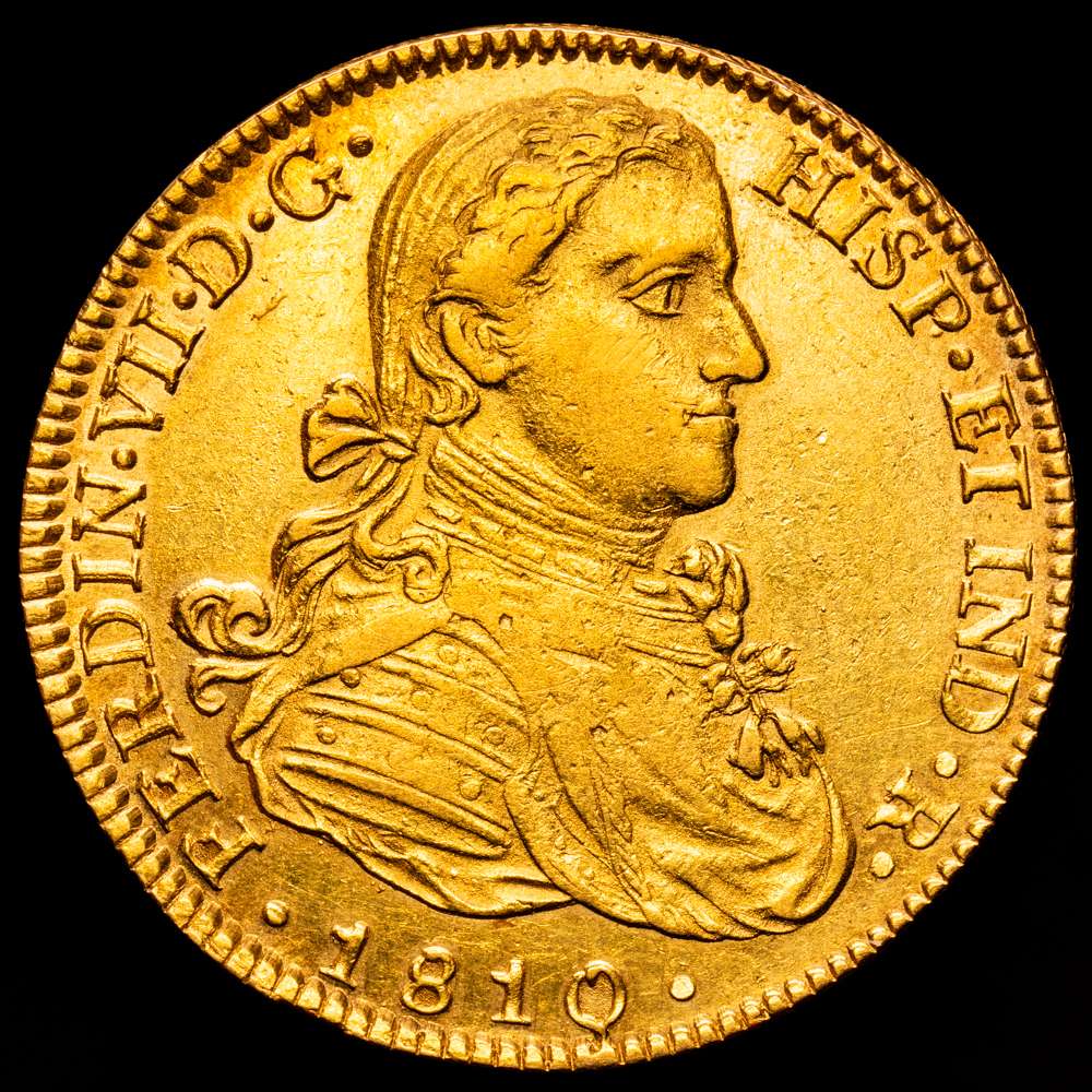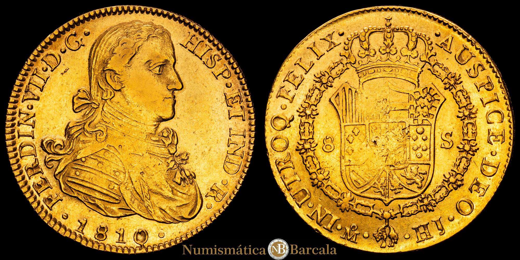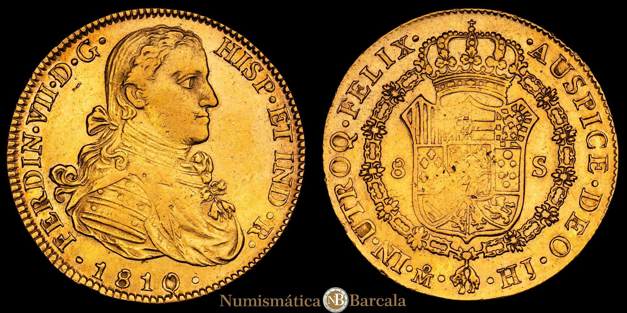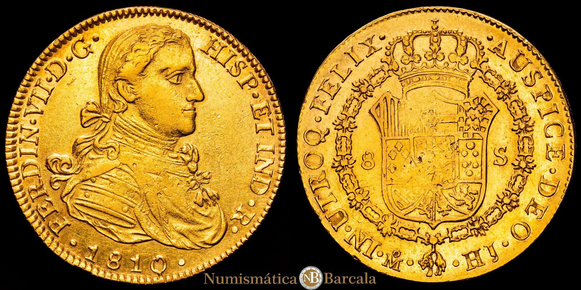 Fernando VII. 1810 México. HJ. 8 escudos. (AC. 1783) (Cal.Onza 1254). Busto imaginario. Acuñación algo floja. 27,01 g. MBC+.