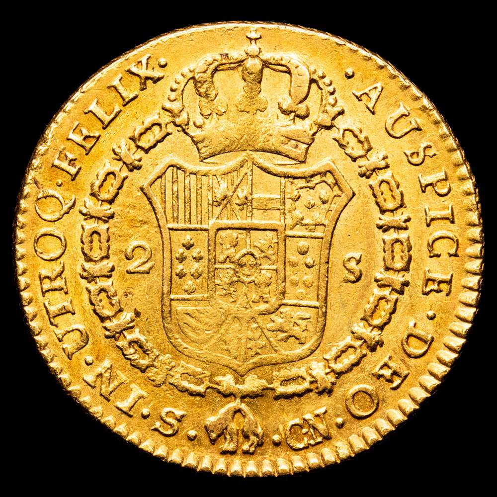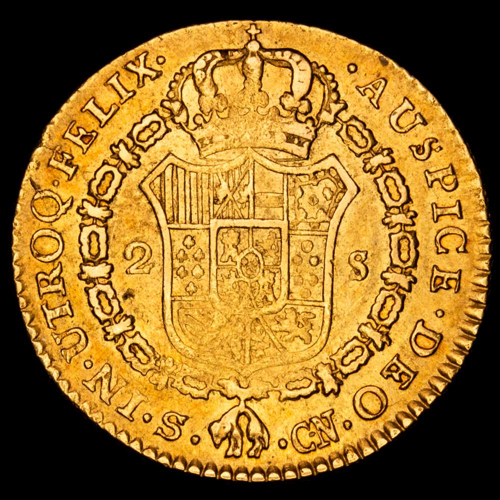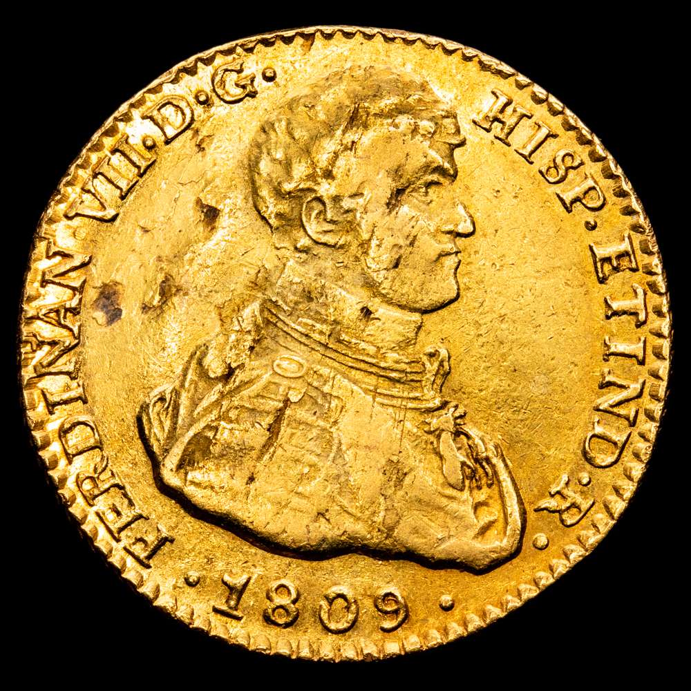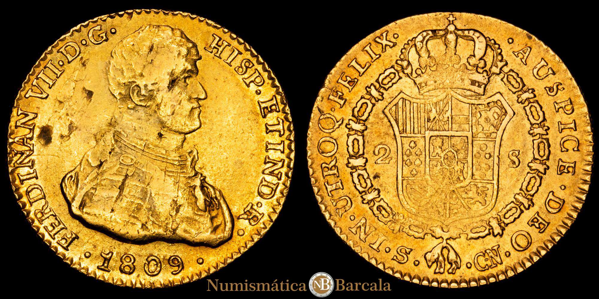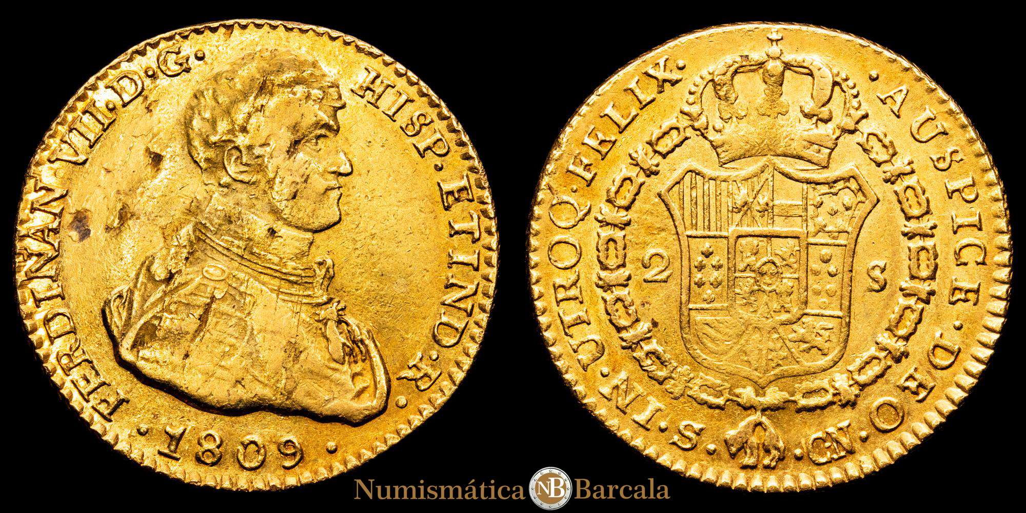 Numismática Barcala > Productos > FERNANDO VII. 2 escudos. 1809. Sevilla. CN. Hojas en anv. AU 6,77 g. 22,86 mm. VI-1382; AC-1667. R.B.O. VF.